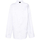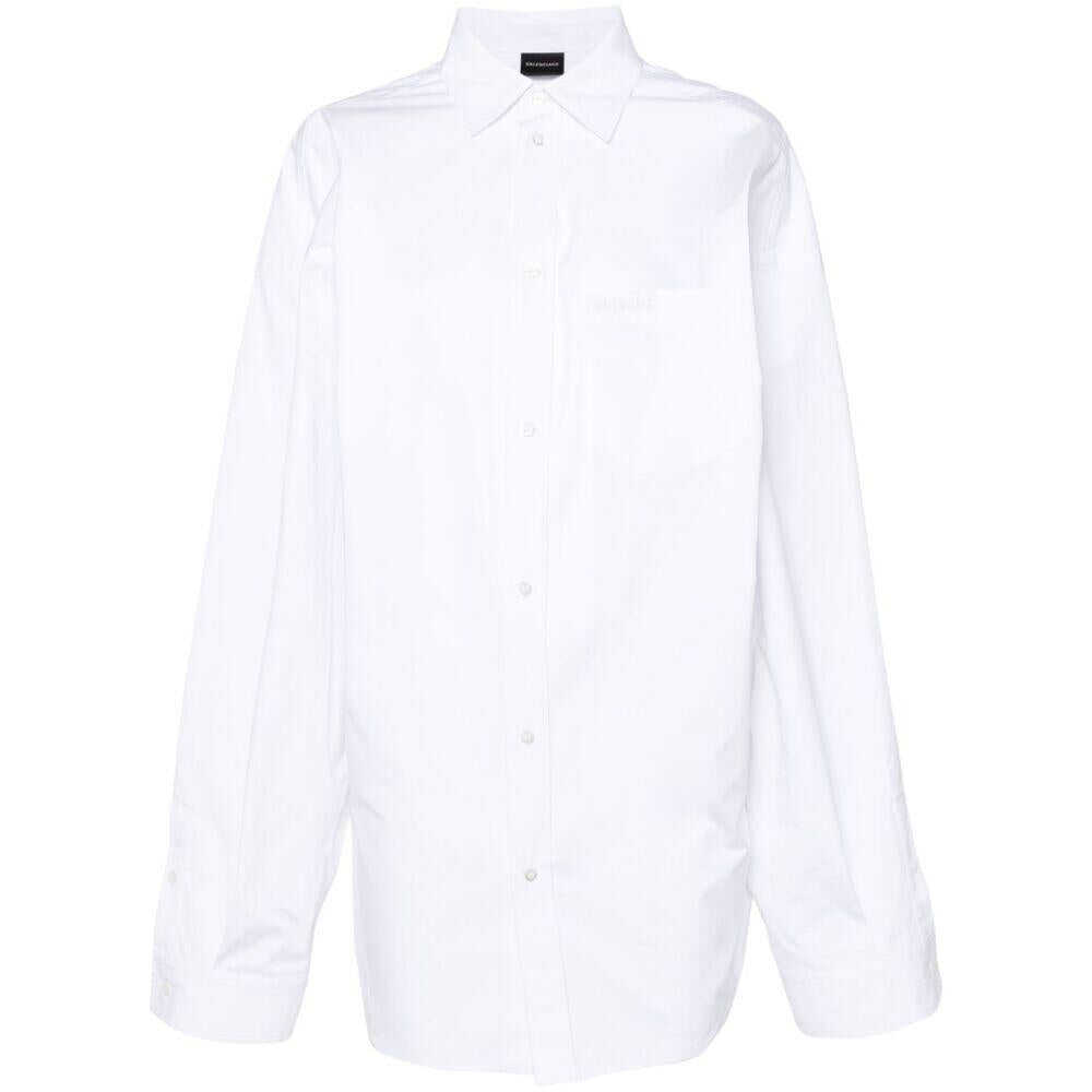 White poplin texture asymmetric design spread collar drop shoulder extra-long sleeves embroidered logo at the chest chest patch pocket curved hem front button fastening