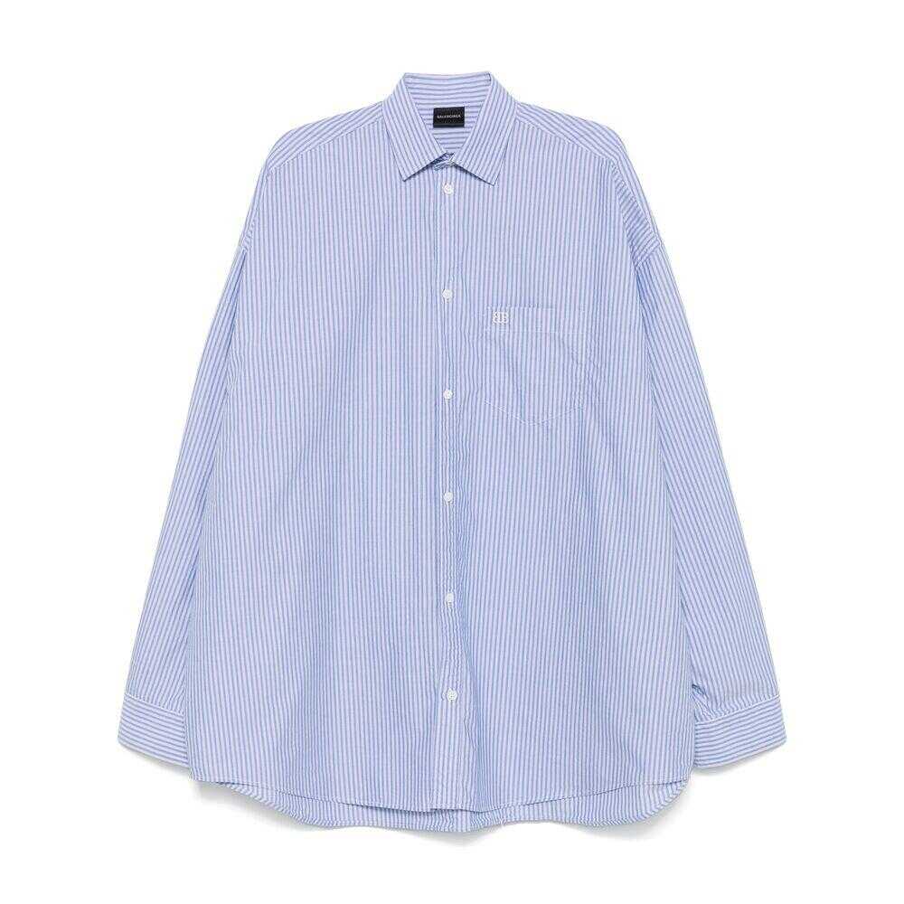 Cerulean blue/white cotton poplin texture vertical stripe pattern front button fastening classic collar drop shoulder long sleeves buttoned cuffs embroidered logo at the chest chest patch pocket knot detailing high-low hem