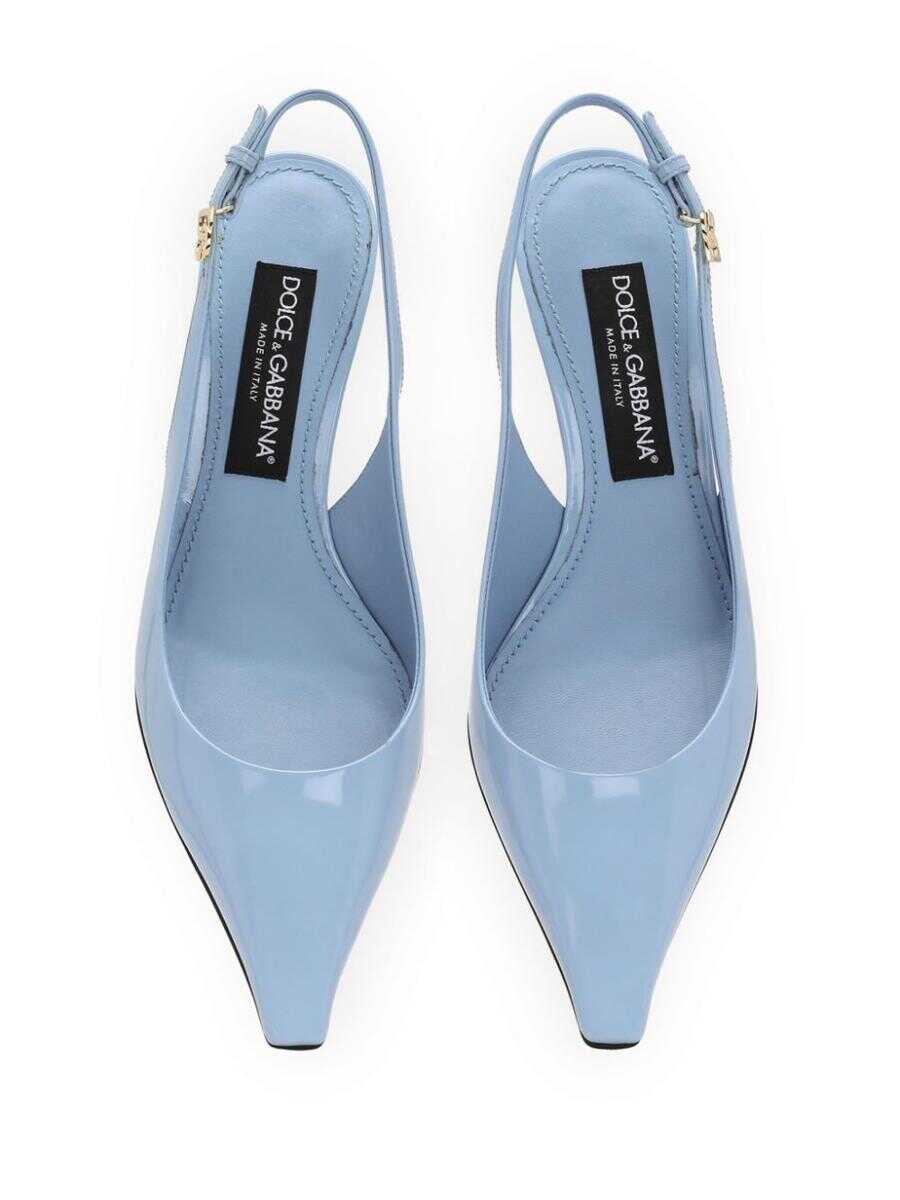 Light blue, calf leather, patent finish, pointed toe, buckle-fastening slingback strap, gold-tone logo plaque, branded insole, high heel.