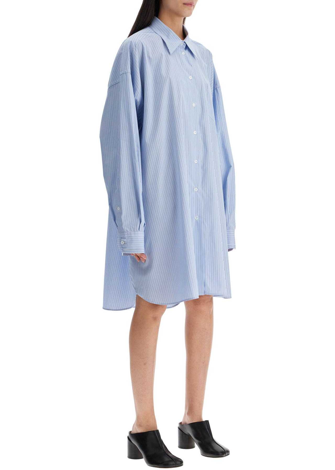 This Maison Margiela maxi shirt is made of striped cotton poplin and features distressed details on the cuffs and a chest pocket. The classic collar and button closure complete the design. The model is 177 cm tall and wears size XS.