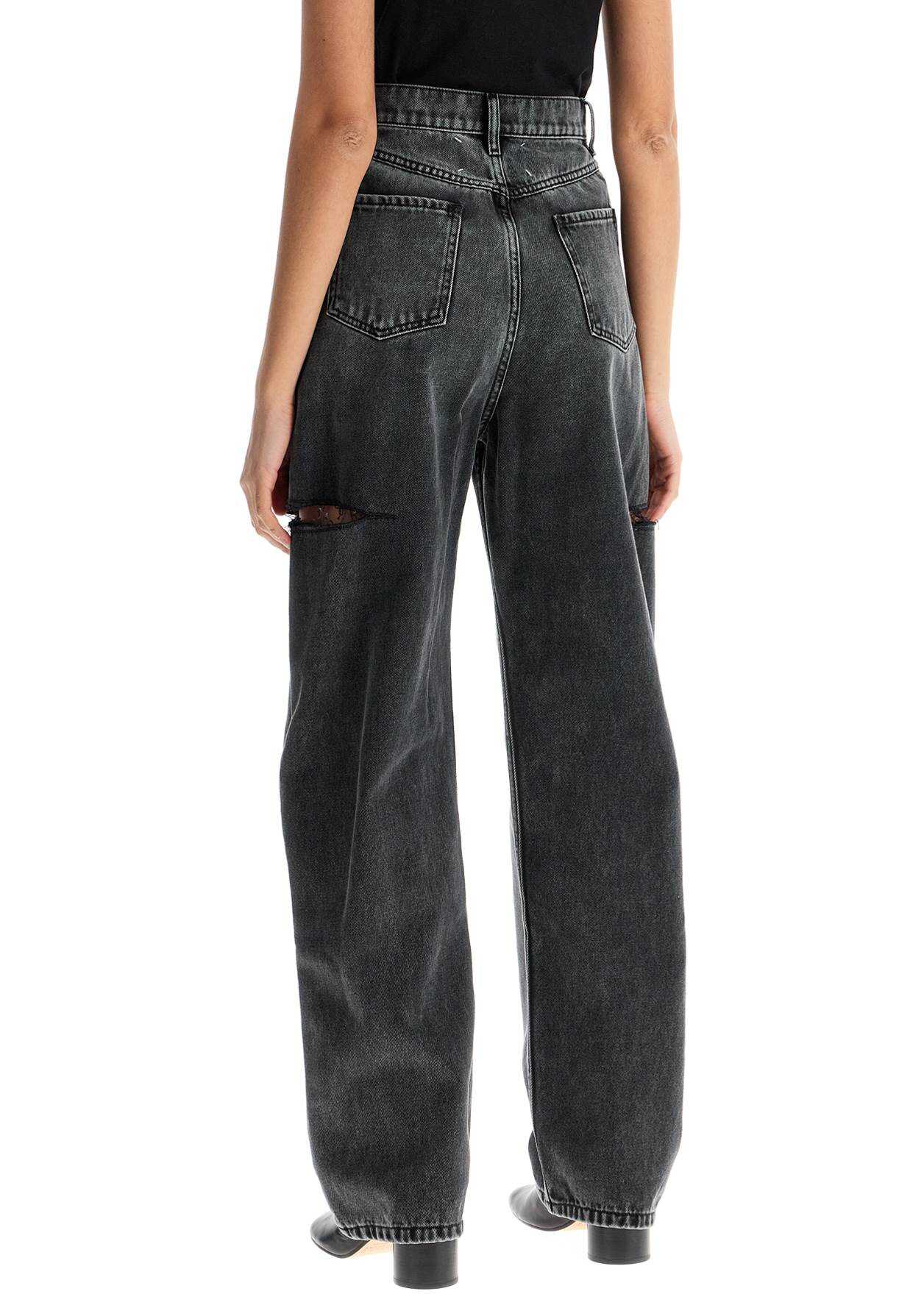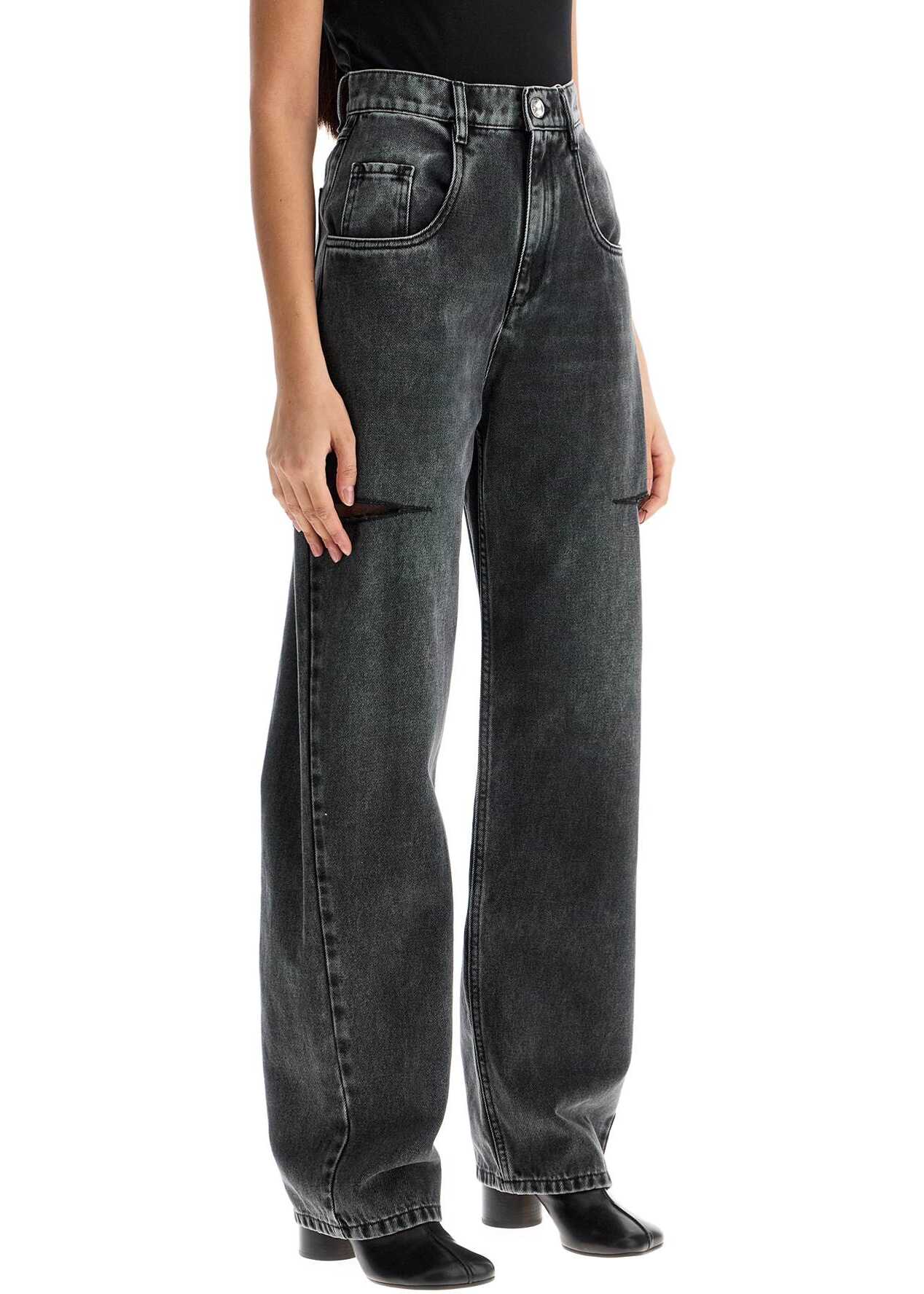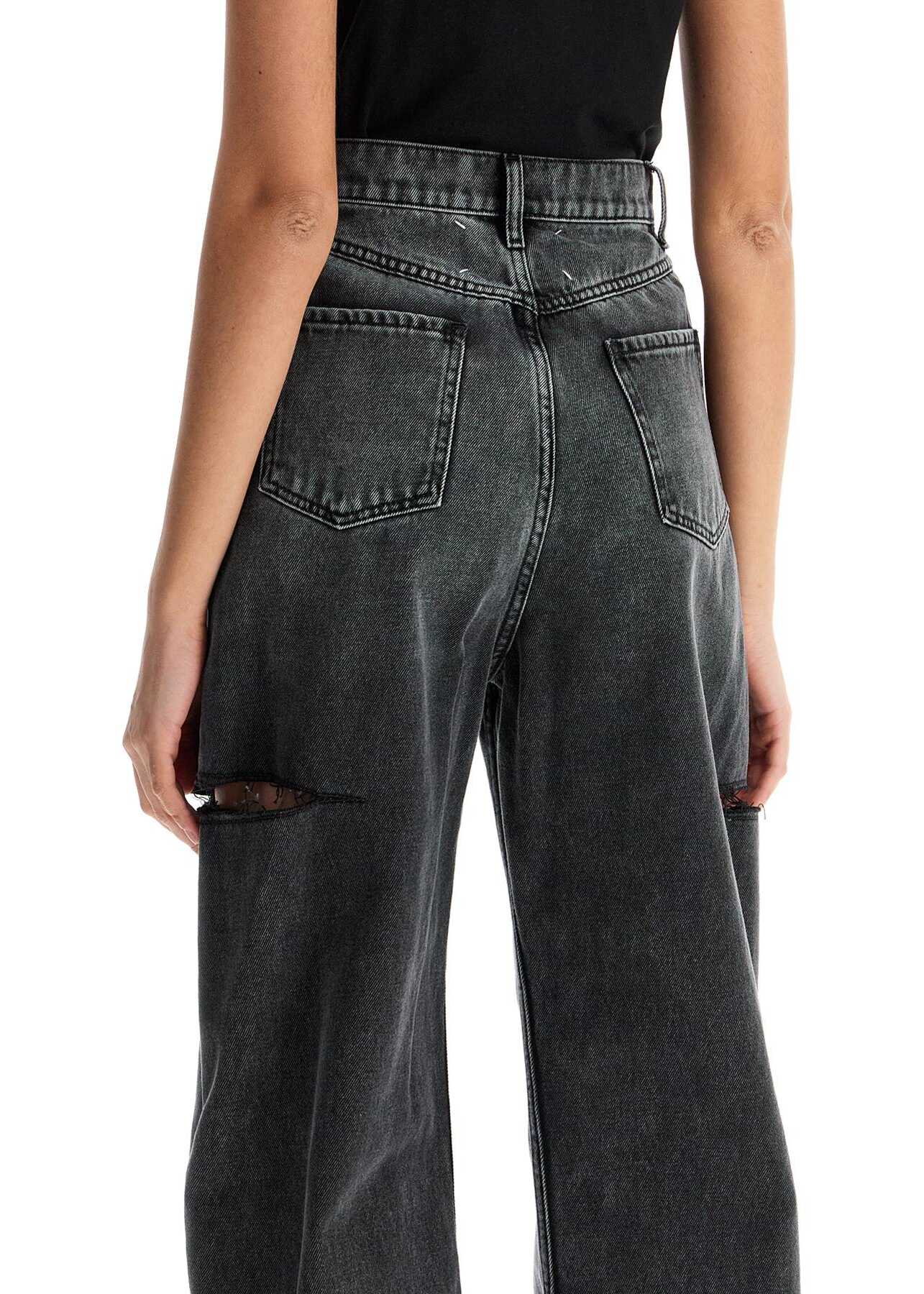 Maison Margiela five-pocket jeans in black washed denim, featuring a straight and relaxed silhouette with high waist and side cuts on the legs. The garment is completed by belt loops, front closure with button and hidden zip, and iconic Four Stitches on the back. The model is 177 cm tall and wears size IT 38.