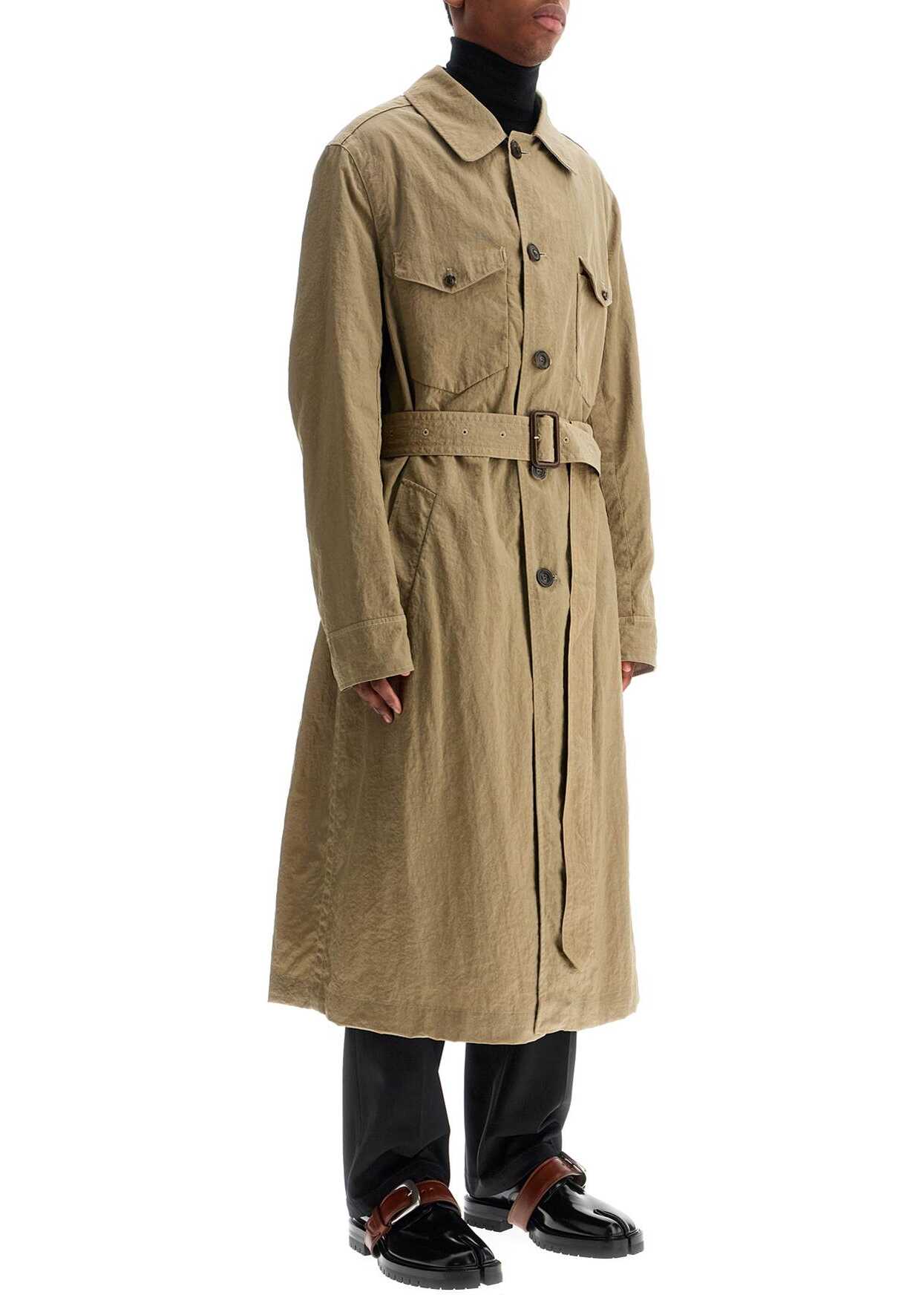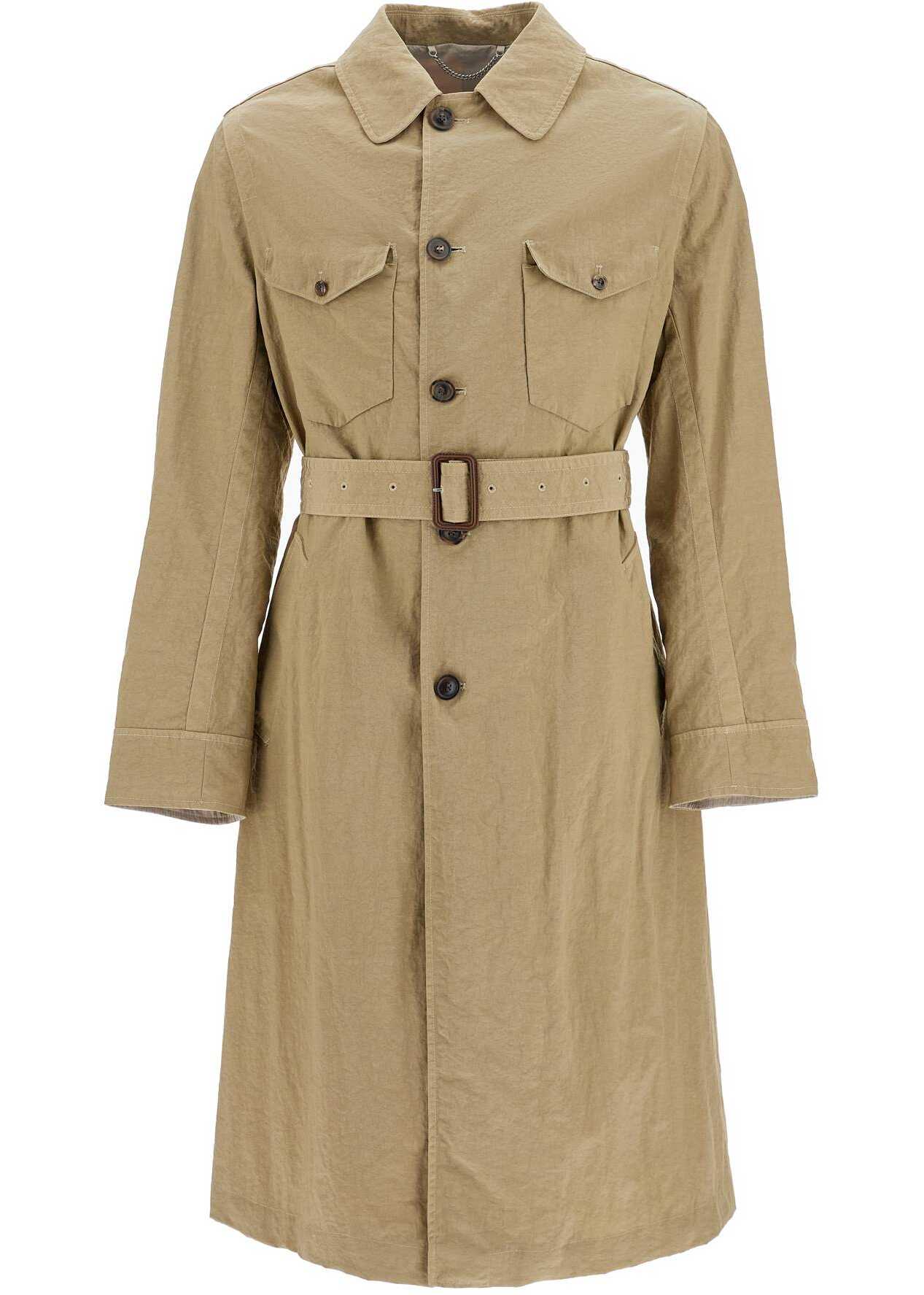 The reversible long trench coat from Maison Margiela features a straight and relaxed fit with a single-breasted button closure. Made of shiny and crinkled technical fabric, the outer side has flap pockets on the hips, two chest pockets, and an adjustable and removable belt at the waist. The inner side is made of a cotton blend and has two side pockets and a chest pocket. A shirt collar, a central slit at the back, and the iconic Four Stitches complete the design. The