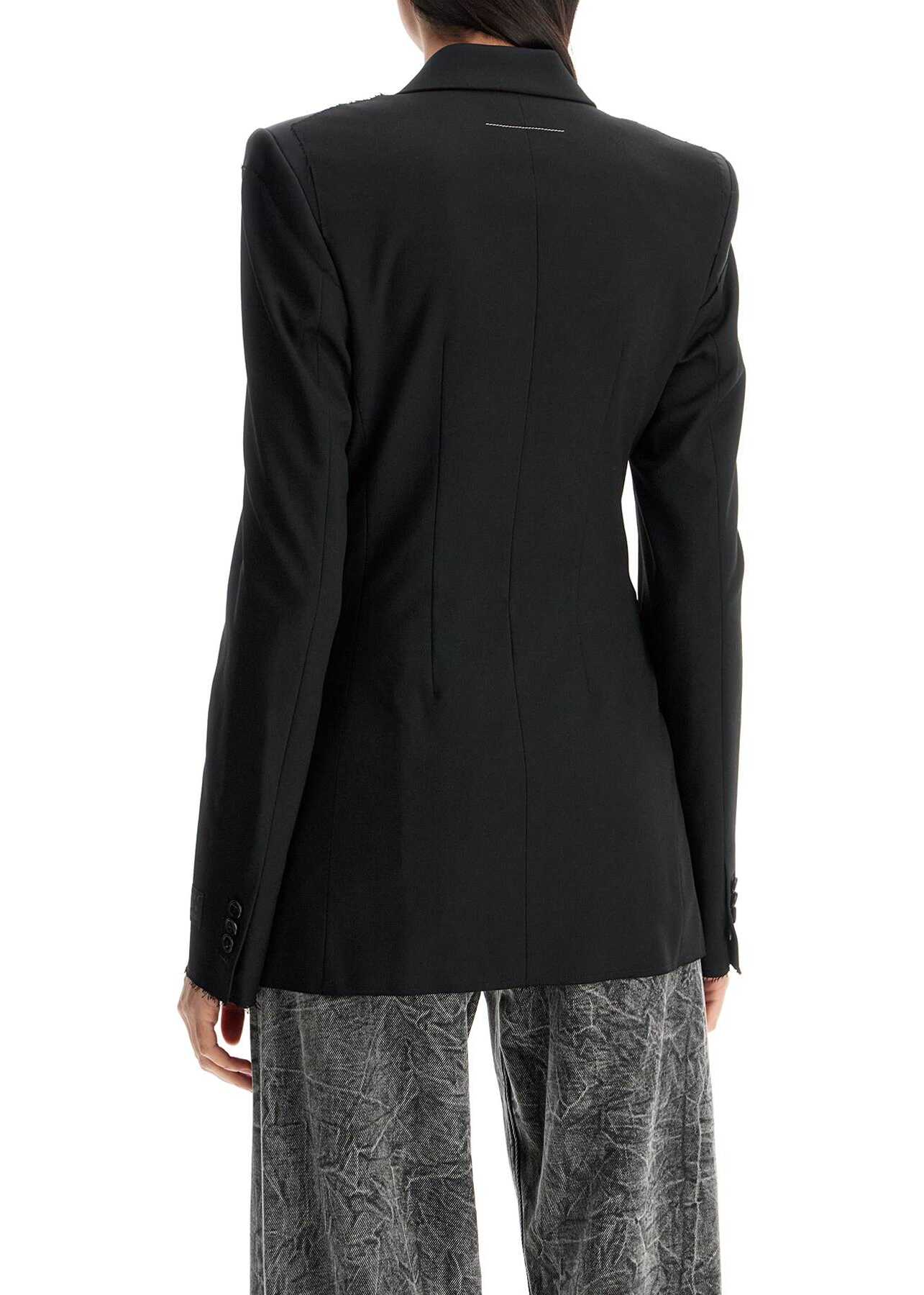 This MM6 Maison Margiela double-breasted blazer is made of viscose twill and features layered shoulders. It has a peak lapel, padded shoulder pads, raw edge hem, and a waist hook to enhance the silhouette. Fully lined. The model is 177 cm tall and wears size IT 40.