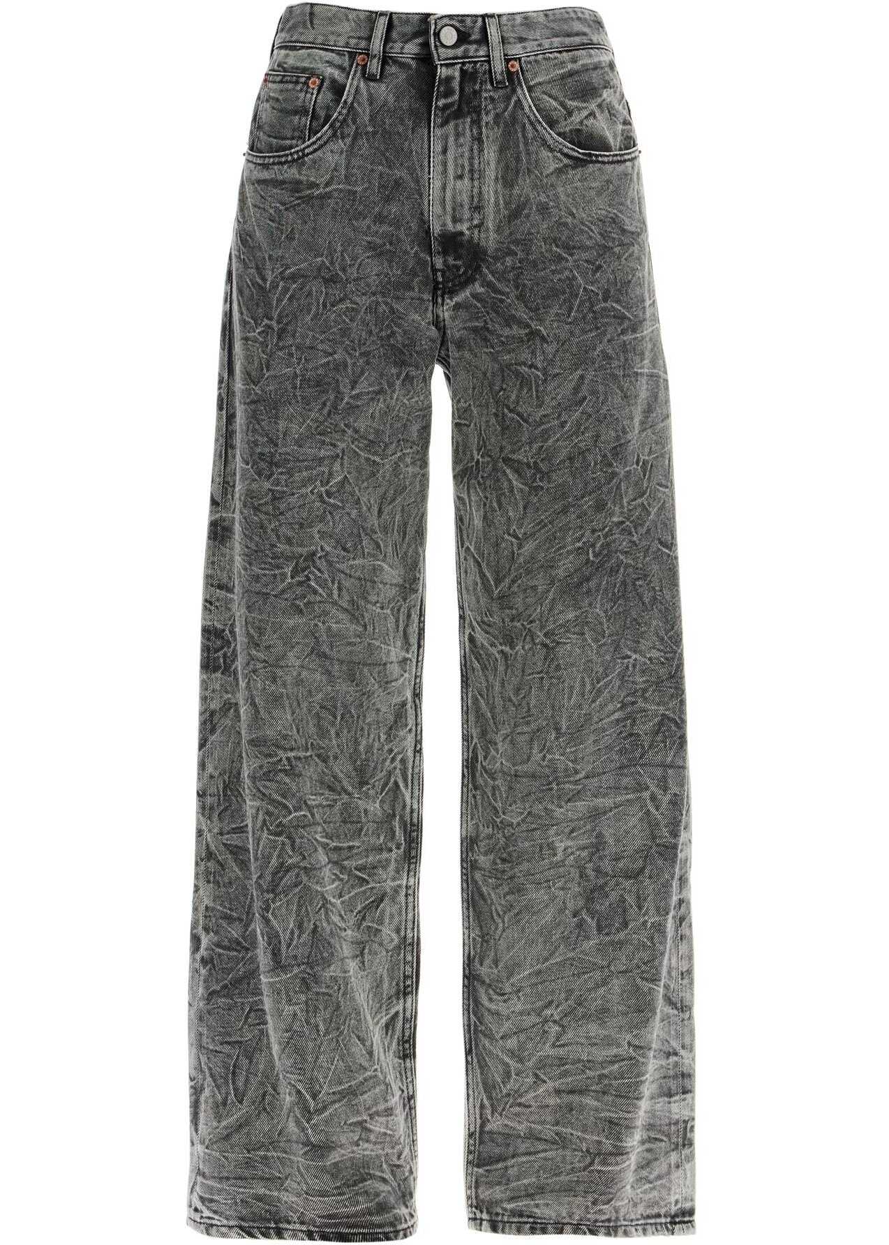 These MM6 Maison Margiela five-pocket jeans are made of washed cotton denim with a distressed effect. They feature a wide leg and a soft fit, with a hidden zip and button closure, an inner drawstring, and classic white stitching on the back. The model is 177 cm tall and wears size 26.