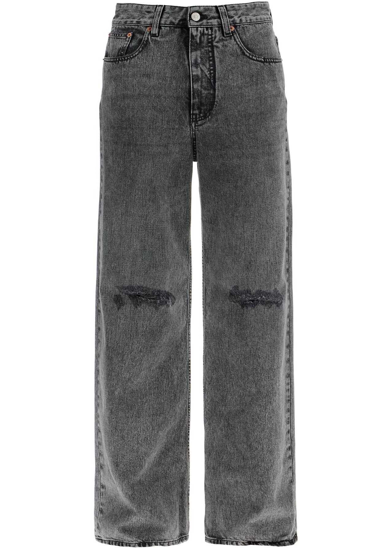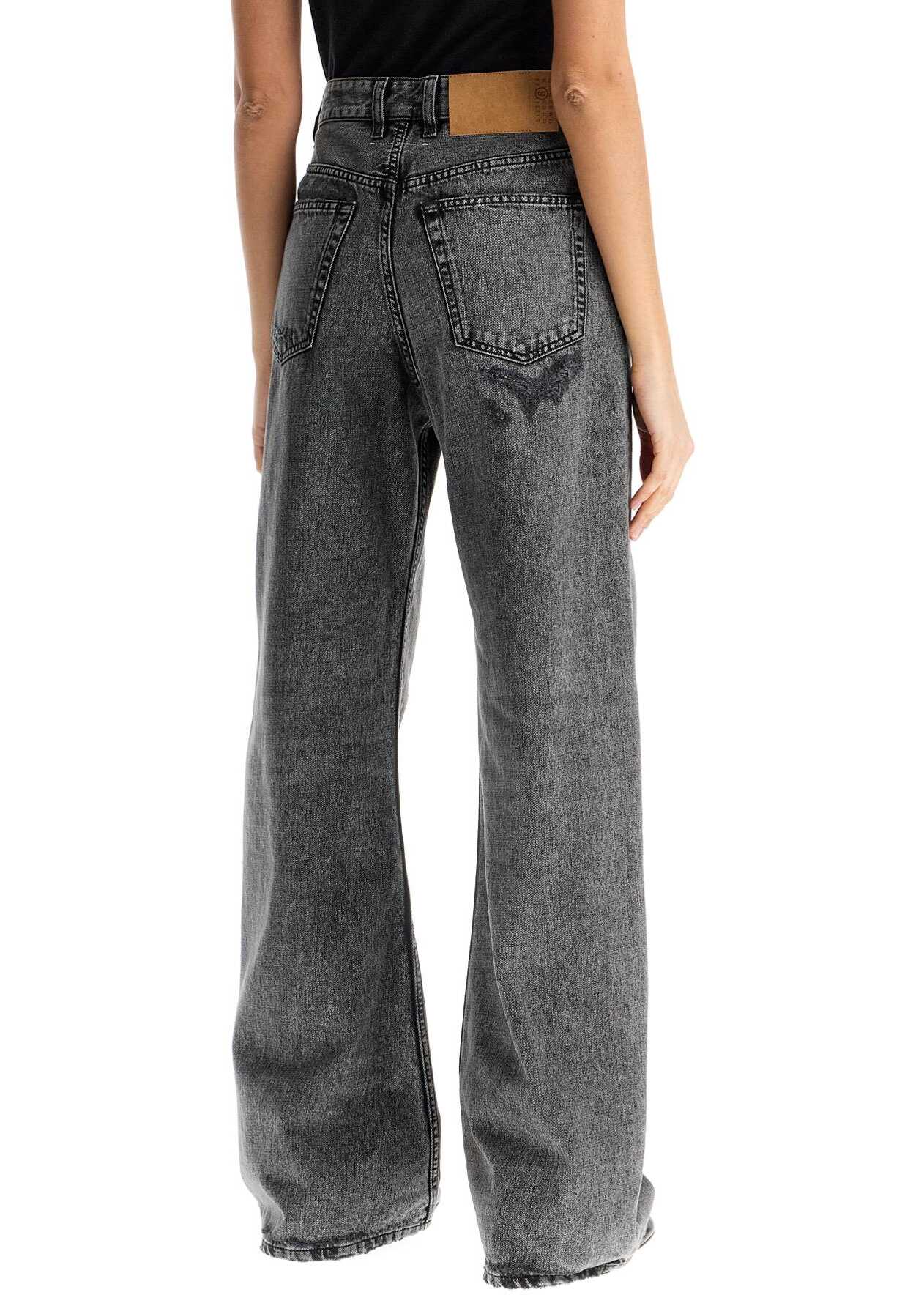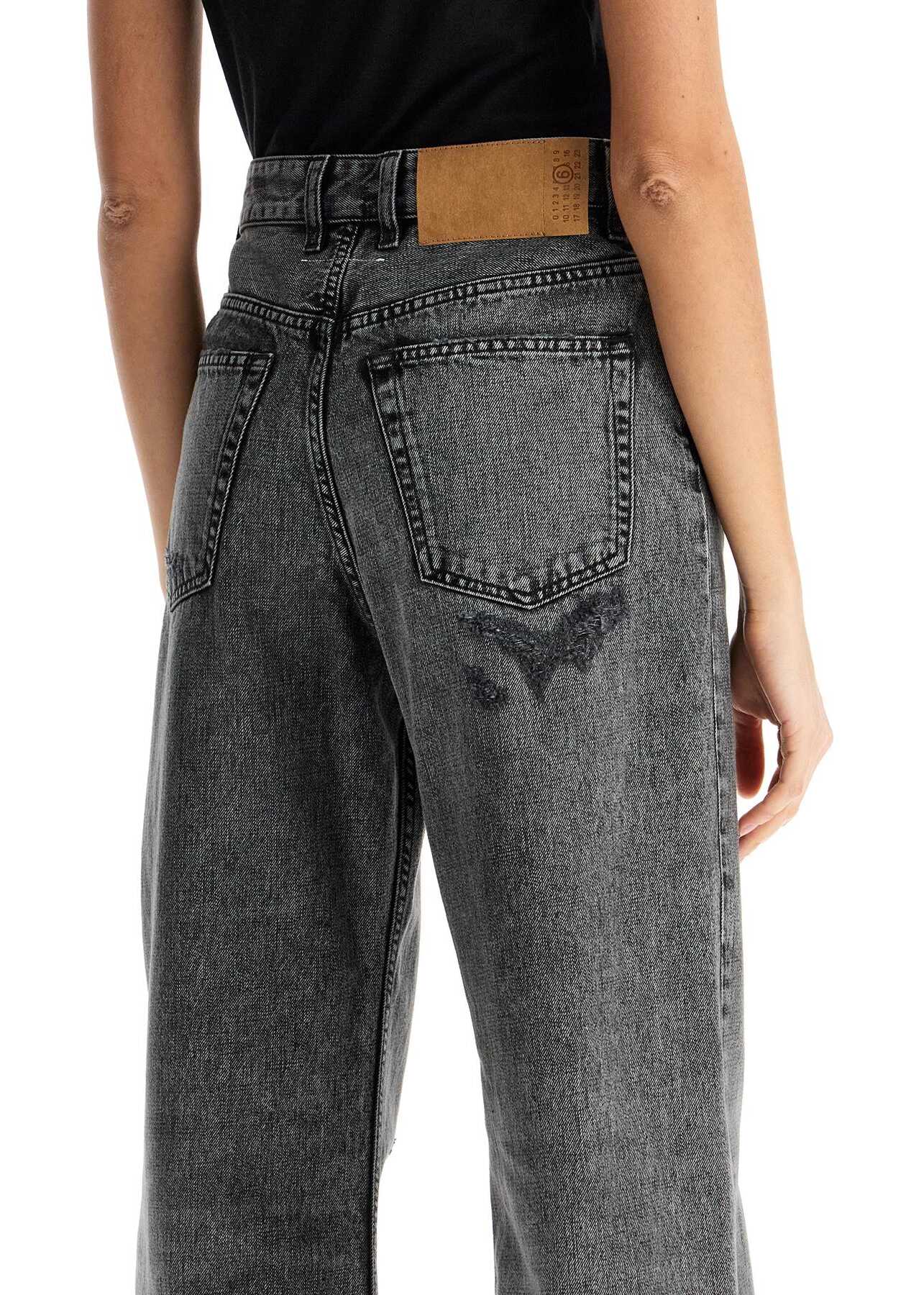 These five-pocket jeans by MM6 Maison Margiela are made of cotton denim and feature a high waist and wide leg. They are adorned with the classic white stitching on the back and distressed details. The model is 177 cm tall and wears size 26.