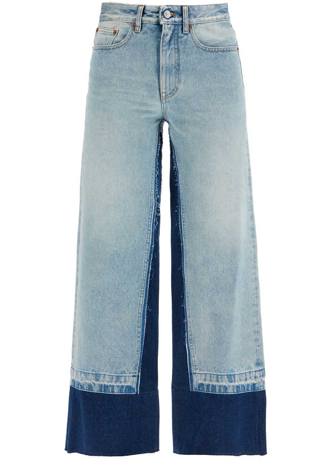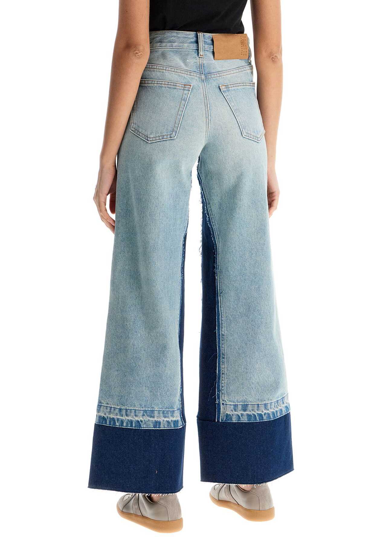 High-waisted jeans from MM6 Maison Margiela with a flared and cropped leg, made of cotton denim with double wash panels for a color-block effect. The five-pocket design is finished with distressed details, a back jacron patch, and personalized by the white stitching line on the back. The model is 177 cm tall and wears size 26.