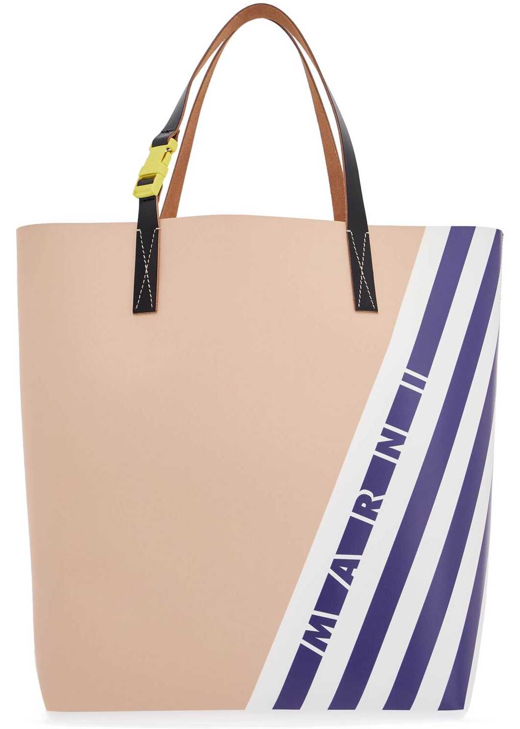 The Tribeca shopping bag by Marni is made of PVC with a striped detail and leather handles, one of which features a buckle. Unlined.