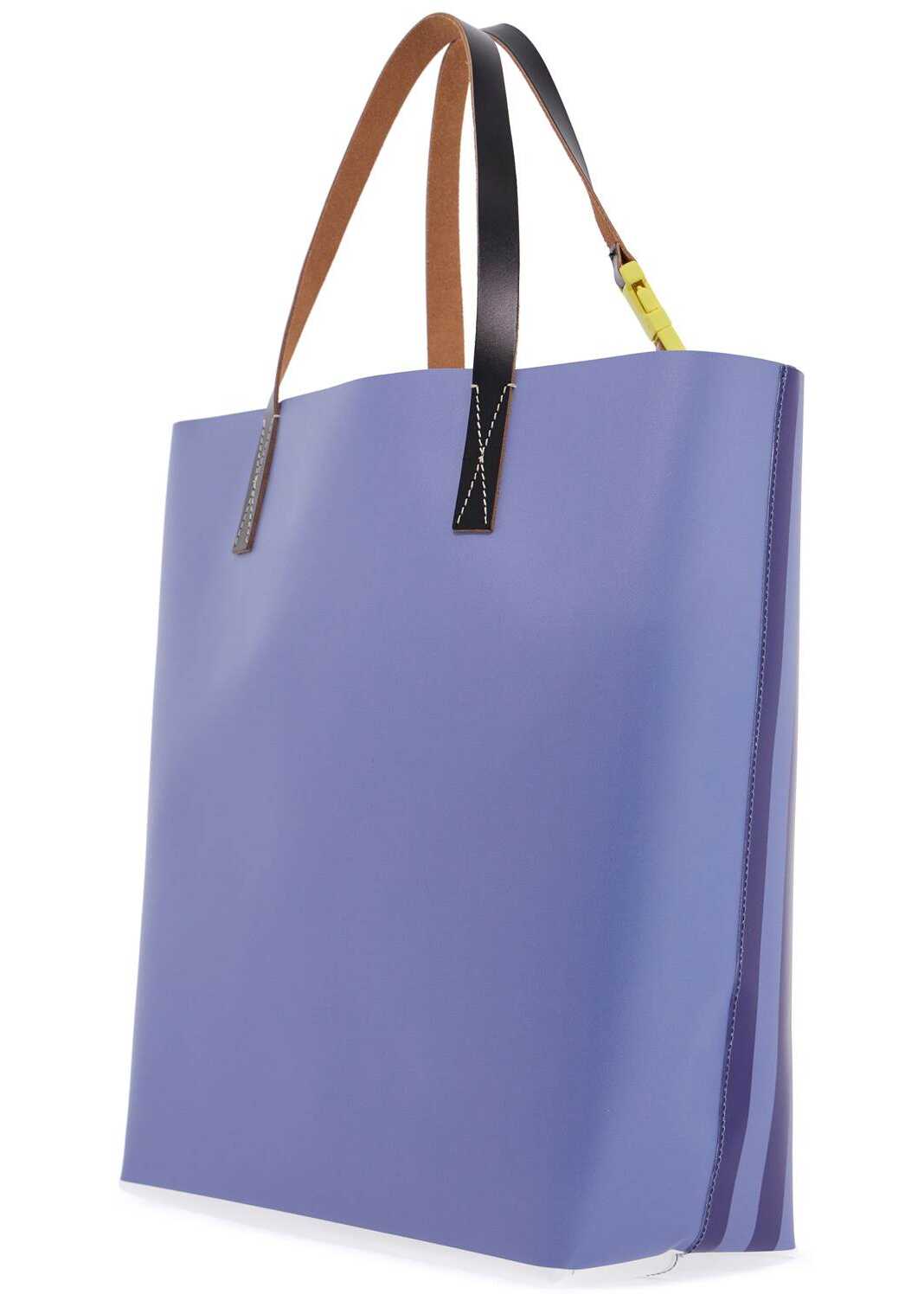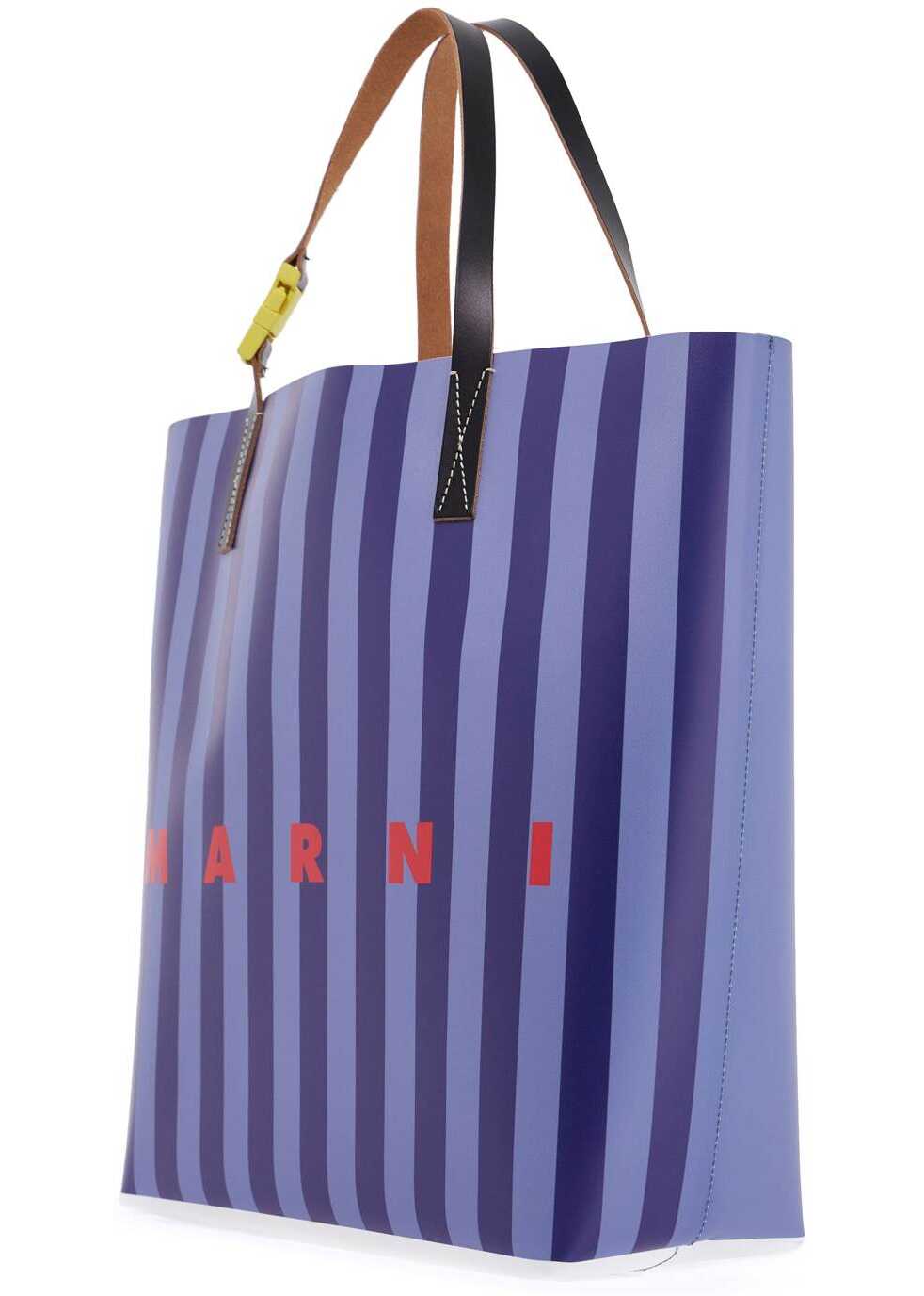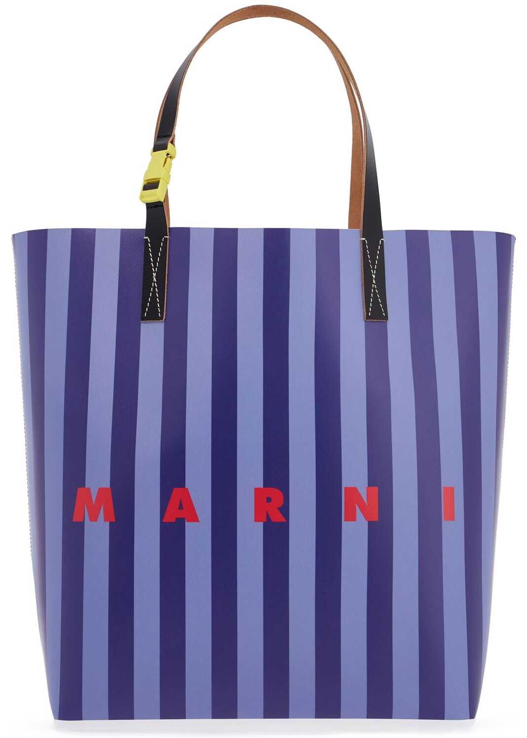 Tribeca tote bag by Marni crafted in striped PVC at front and in solid color at back, with contrasting lettering logo print on front and leather handles, one of which complete by a buckle. Unlined.
