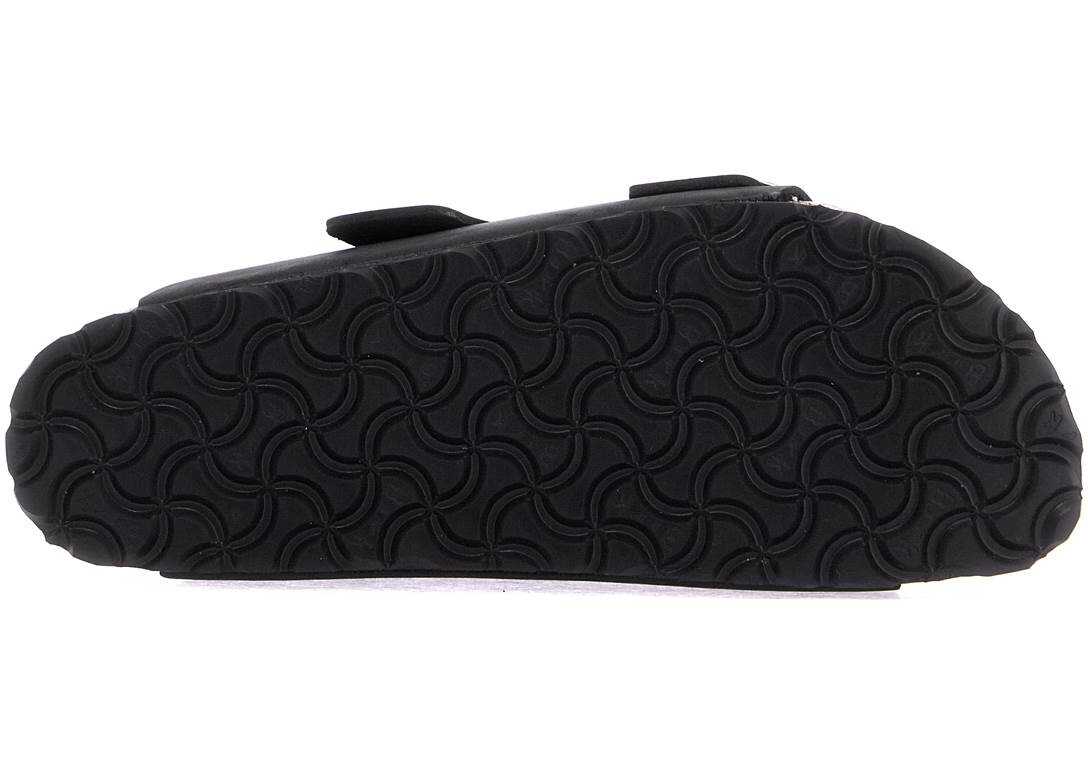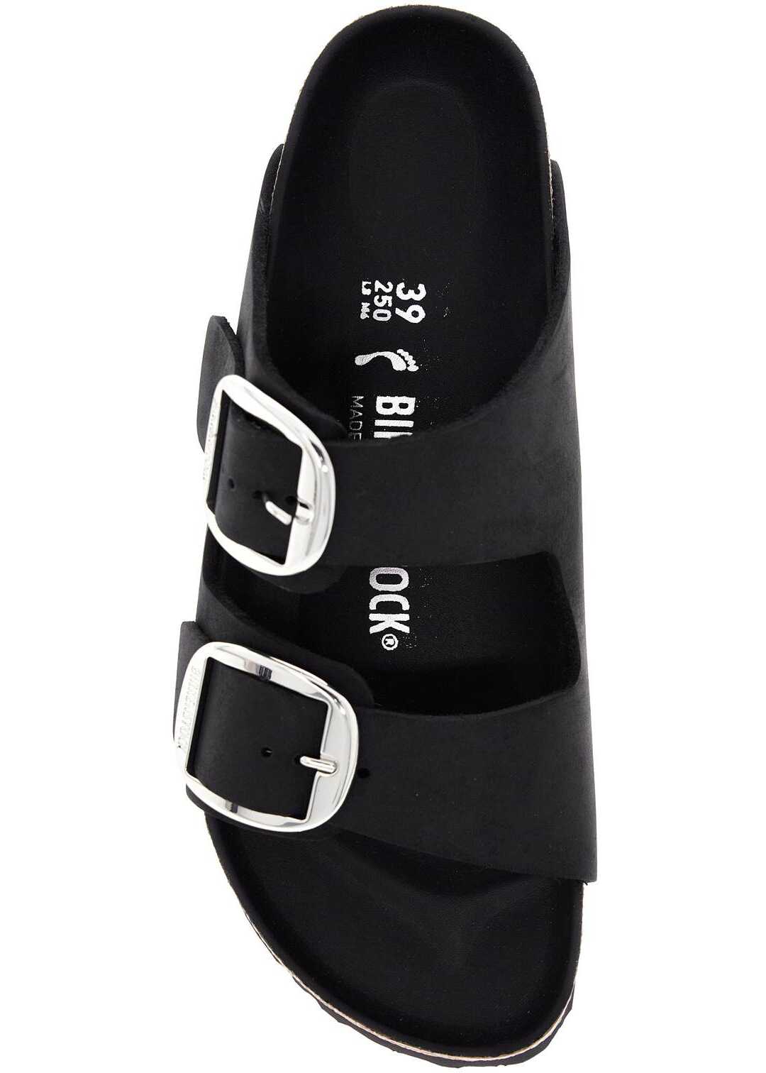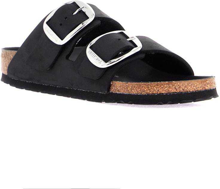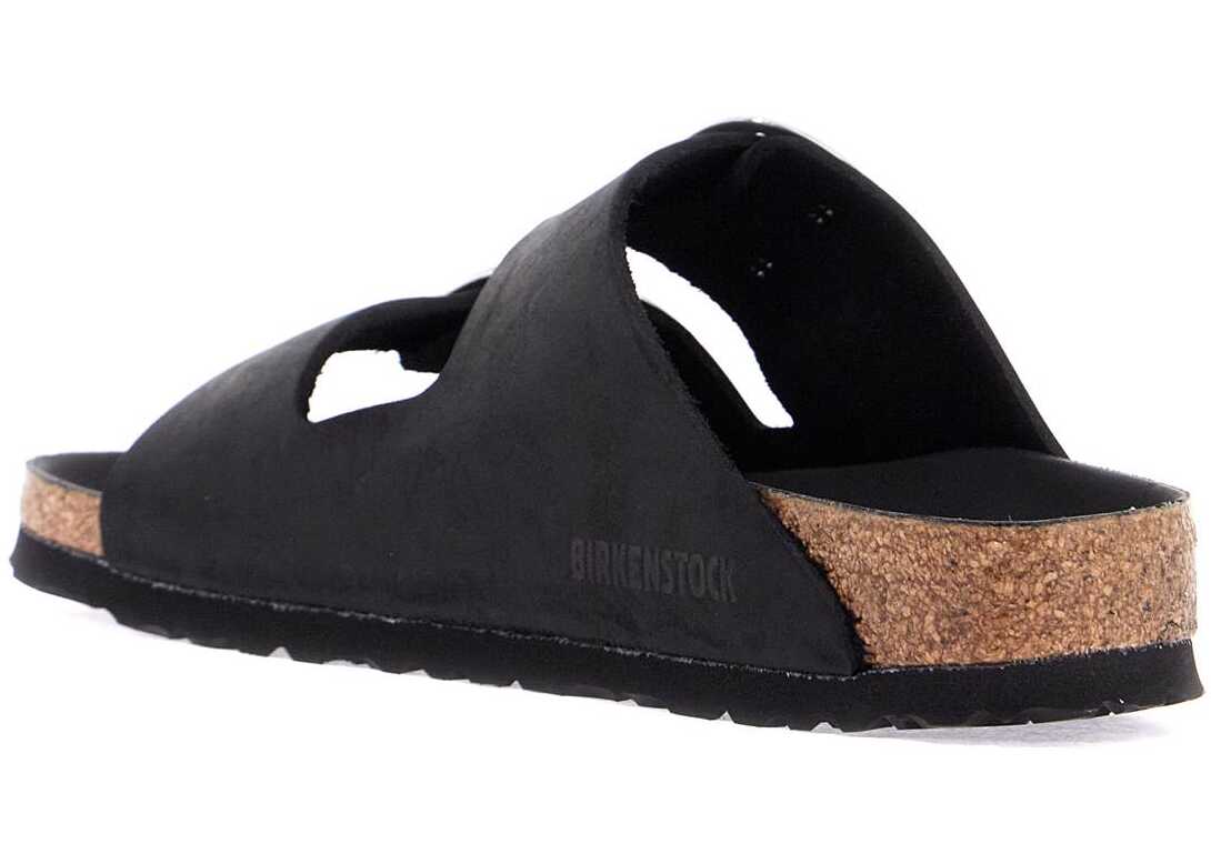 BIRKENSTOCK Arizona slides crafted in oiled nabuck leather featuring double adjustable strap with oversize silver-finished metal buckle with debossed logo. Smooth leather footbed, moulded cork and latex sole and EVA tread. Narrow fit.
