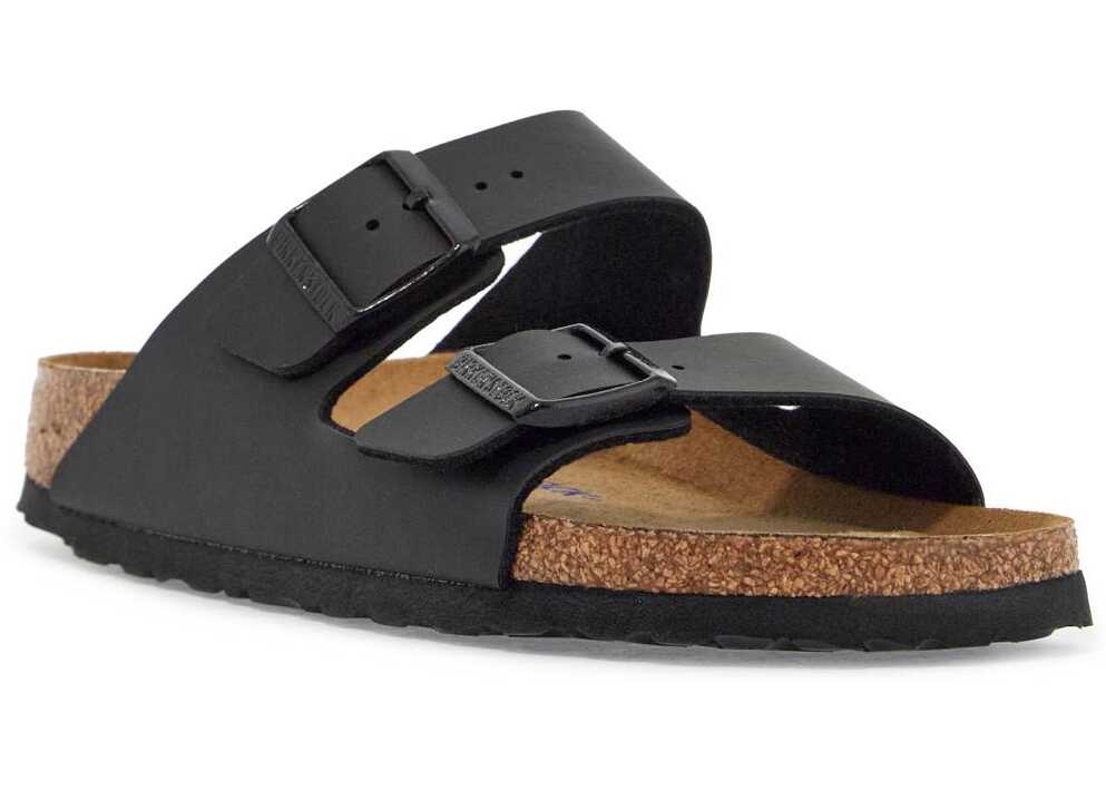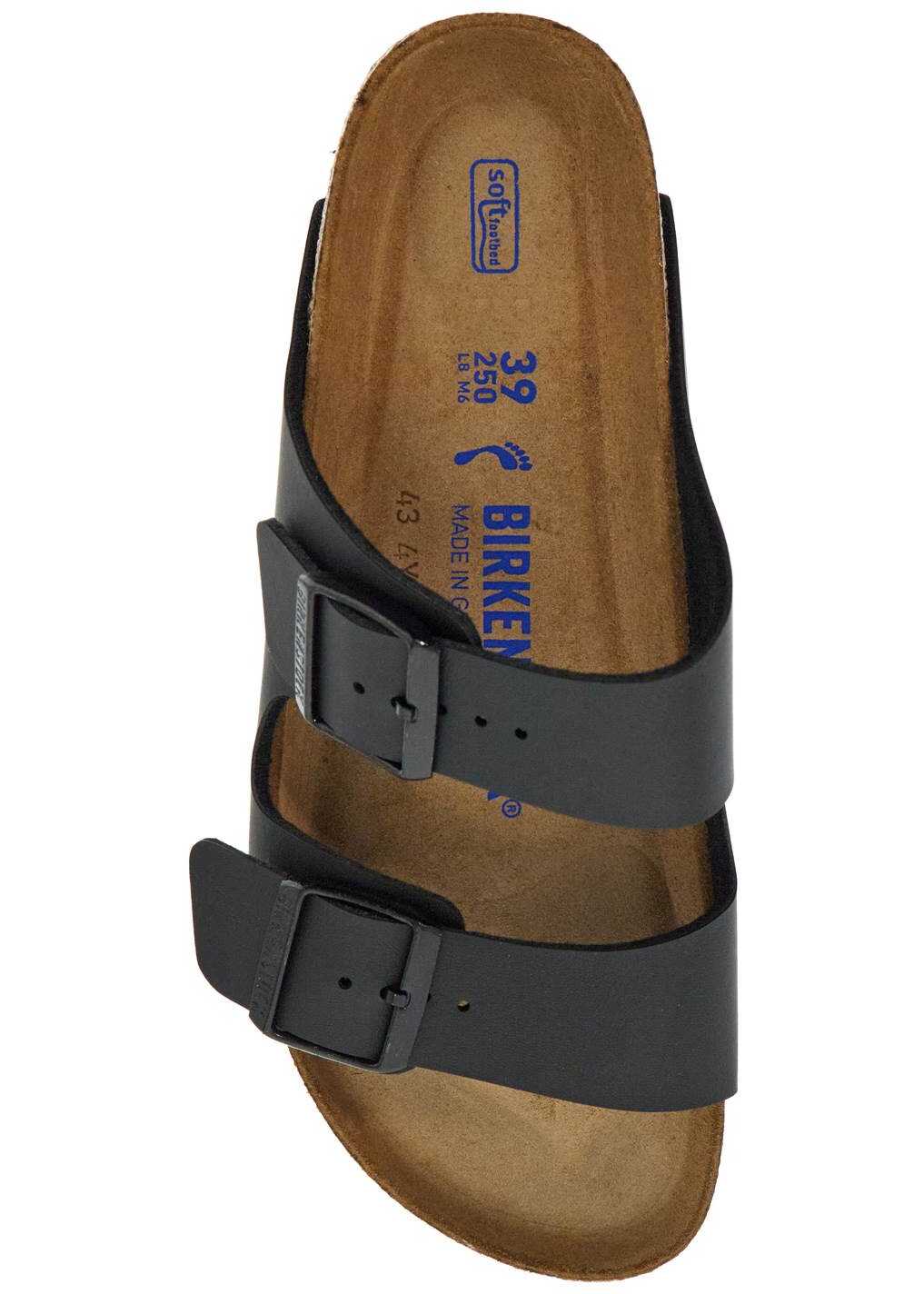 Arizona slides by BIRKENSTOCK made in Birko-Flor®with double adjustable strap with painted metal buckle tone on tone with debossed logo. Suede leather footbed, moulded cork and latex sole and EVA tread. Soft footbed and narrow fit.
