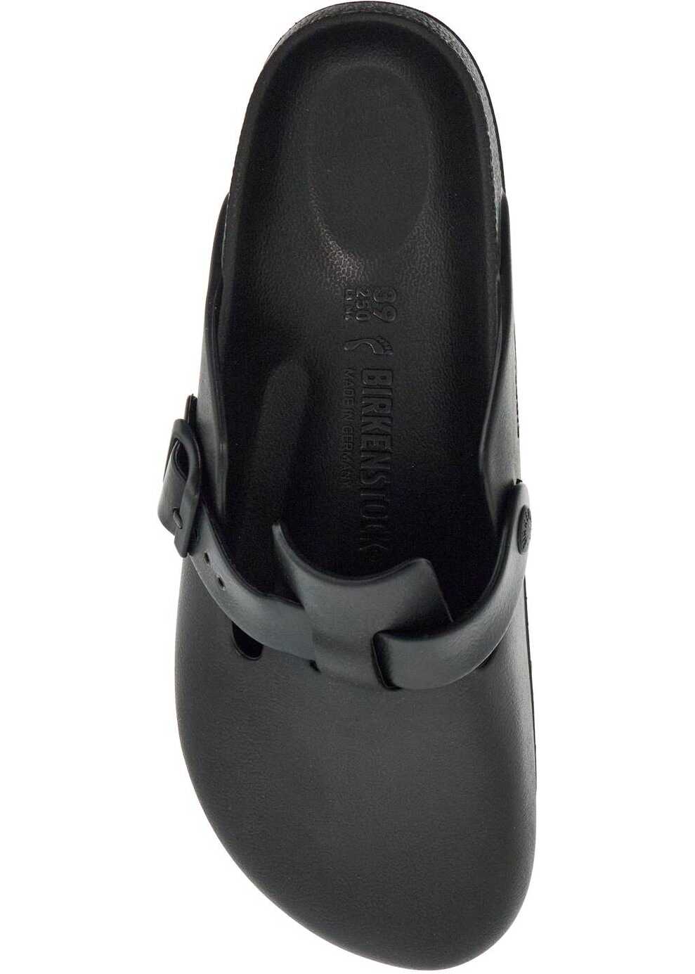 The Boston BIRKENSTOCK clogs are made of EVA with an adjustable strap and a tone-on-tone buckle featuring the printed logo. They have an anatomical footbed and a rubber sole. The fit is narrow.