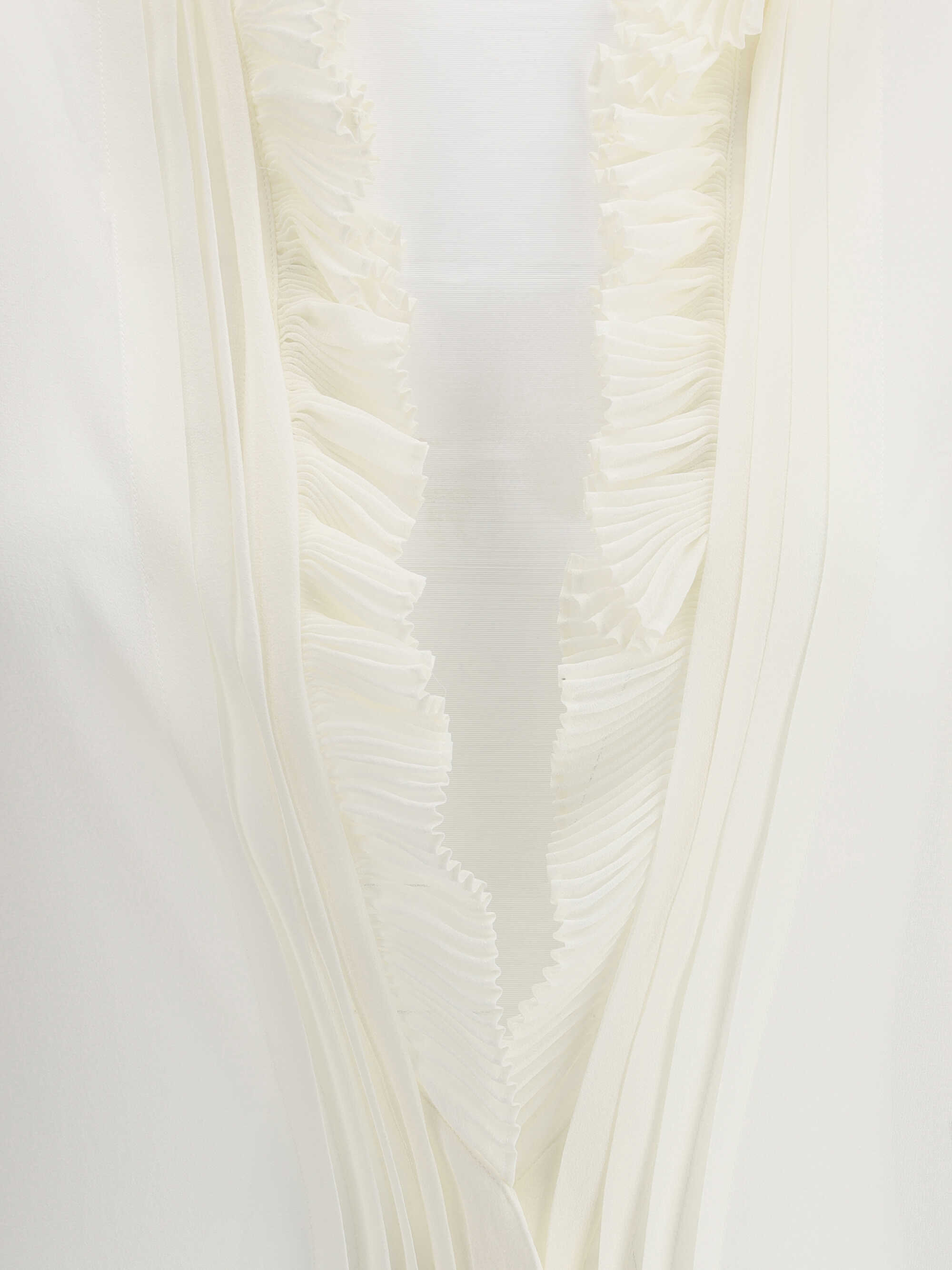 Tom Ford's silk georgette blouse is an elegant and sensual piece, featuring a semi-sheer design that enhances the lightness of the fabric. The deep V-neckline on the front, embellished with ruffles, lends a feminine touch, while adjustable button cuffs add functionality and sophistication. Perfect for a sophisticated and bold look, combining the sensuality of the fabric with classy details.