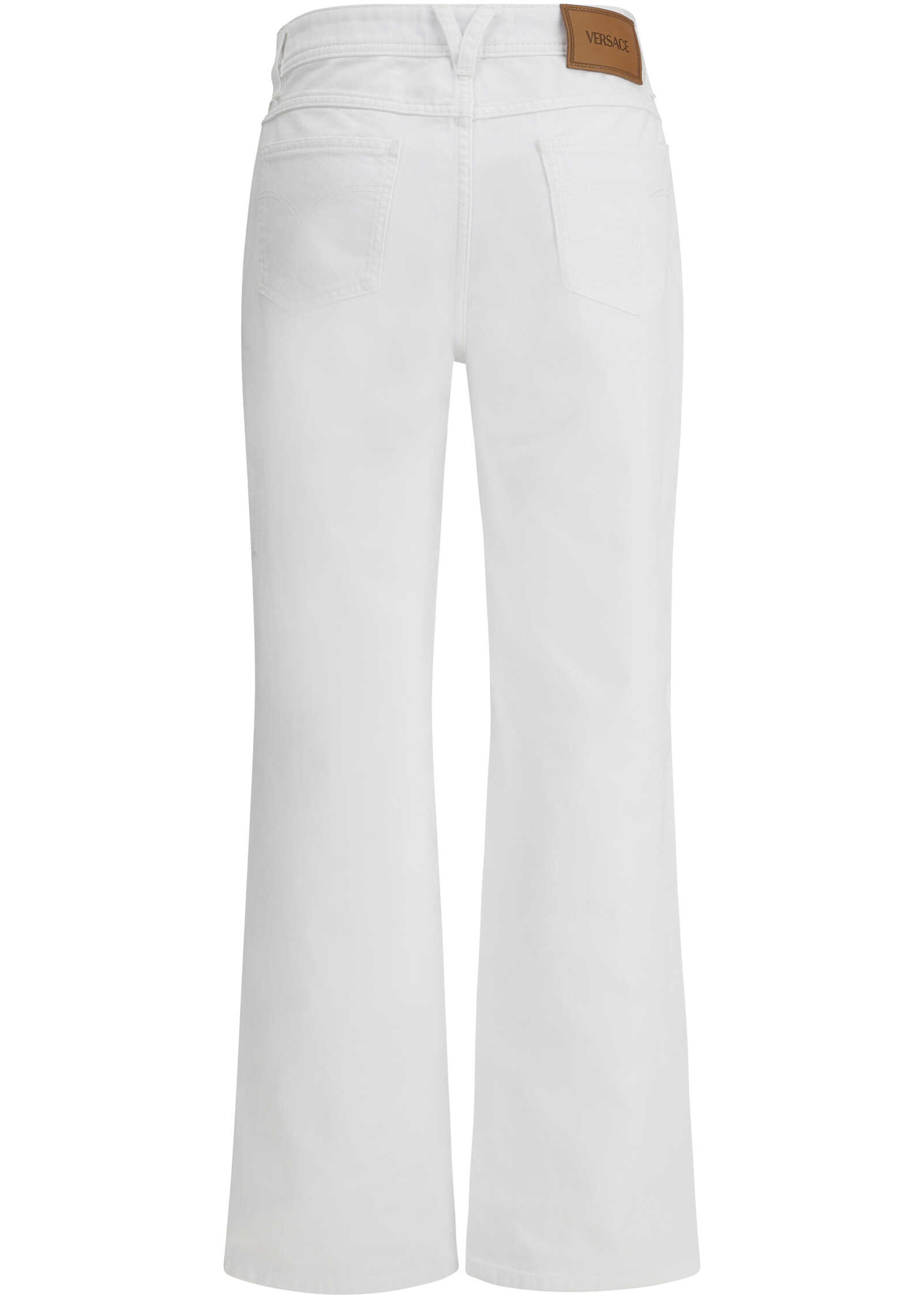 Versace's white cotton jeans offer a modern, sophisticated look with their straight five-pocket design. The button-and-zip front closure, along with belt loops, ensures a comfortable and practical fit. The high waist slims the silhouette, while the waistband details, embellished with the iconic Medusa logo, add a touch of luxury and distinction. A perfect garment for those seeking contemporary style with a high-fashion accent.