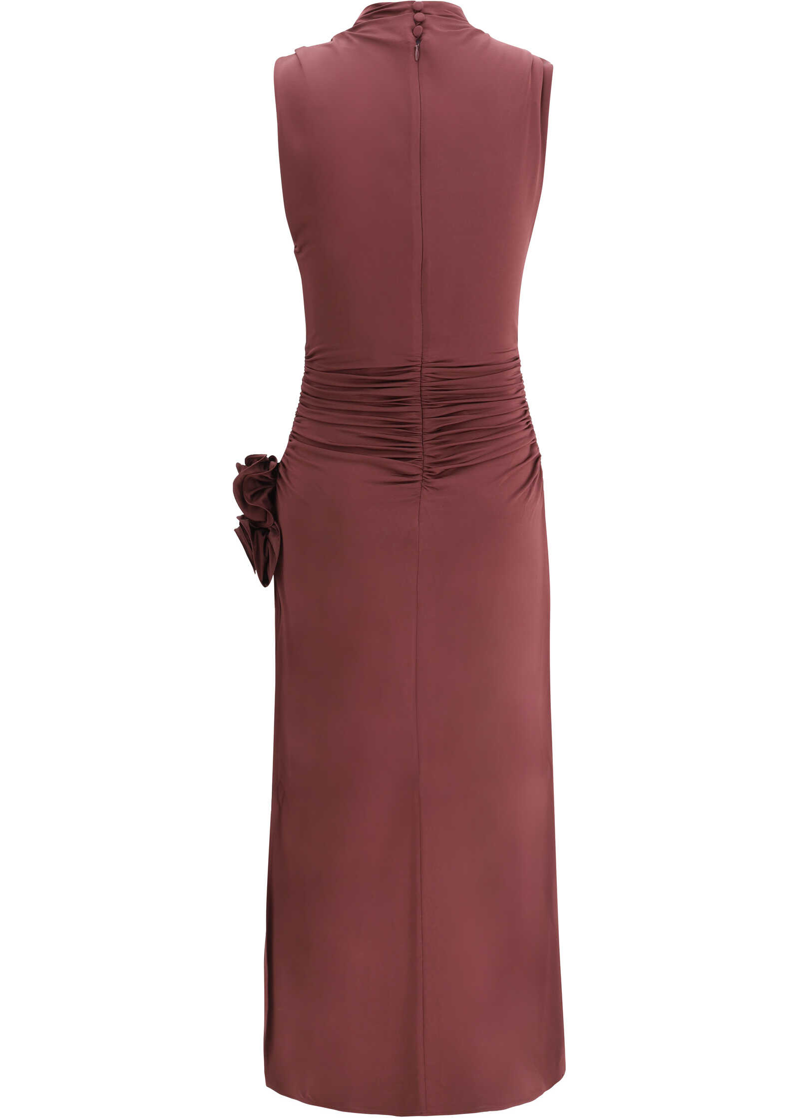 Magda Butrym's long slit dress is a sleeveless style with a sophisticated and sensual design. Featuring an elegant draped front, the dress features a high neck that enhances its refined silhouette. A deep side slit with draping adds movement and a bold touch, while the brand's two iconic 3D roses, applied at the side, lend a distinctive and romantic element. The garment is made in a monochrome pattern, which emphasizes its elegance and versatility, perfect for special evenings and important occasions.