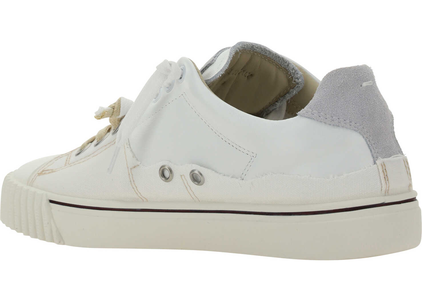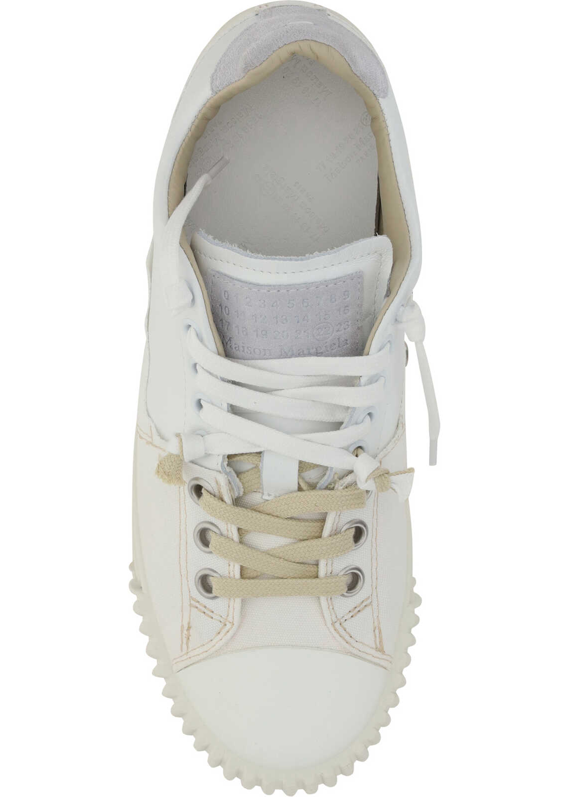 Calfskin New Evolution Sneakers by Margiela, rubber reinforced round toe, front lace-up closure, flat sole, patch with iconic brand signature applied tone on tone on front tab.