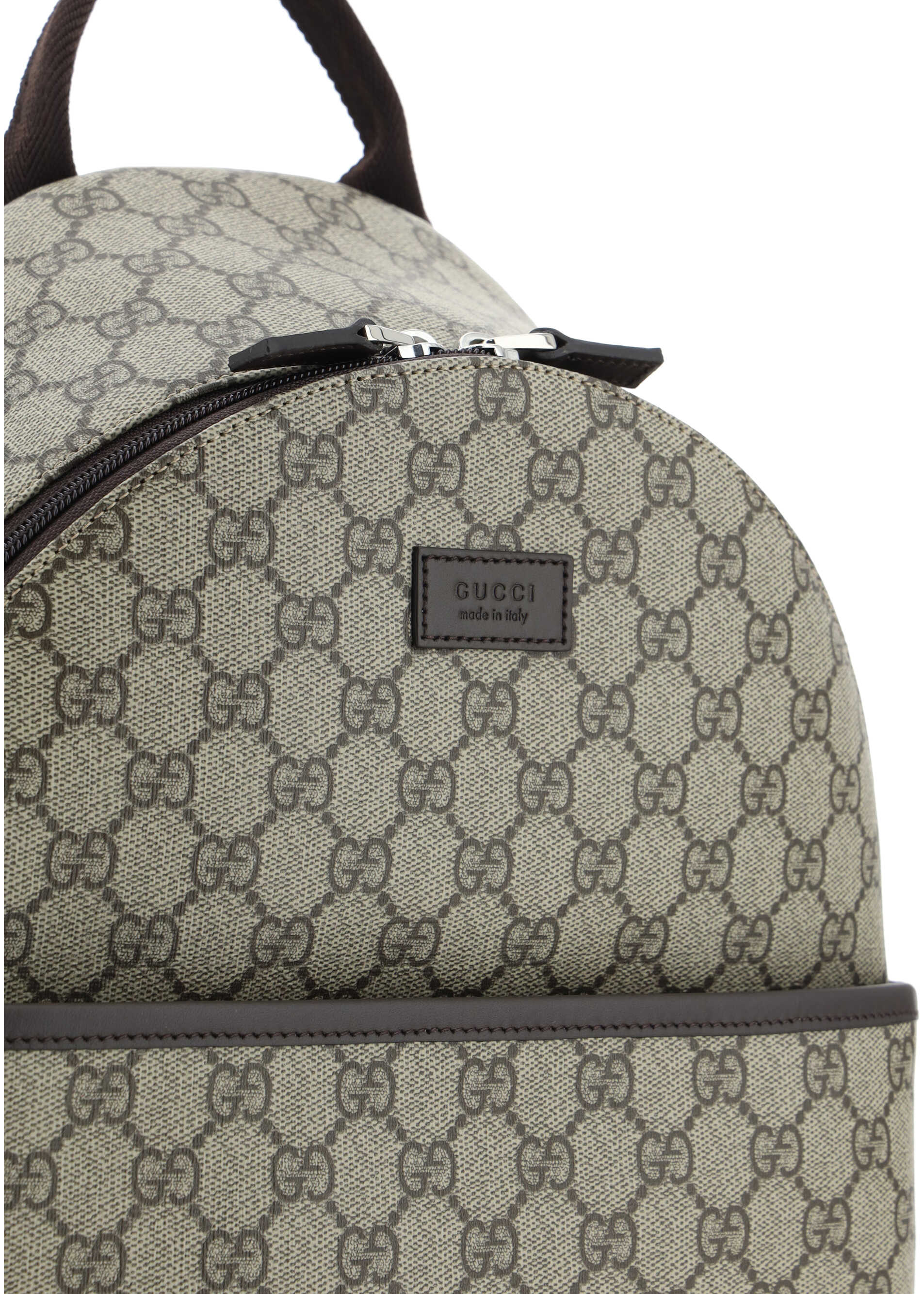 Backpack by Gucci, double-slider zipper top closure, contrasting applied brand monogram plaque on front, padded and adjustable shoulder straps with contrasting trim, iconic all-over repeated brand logo, welt pocket on front.