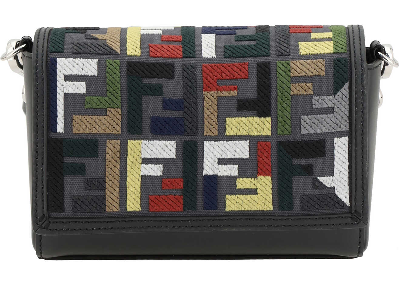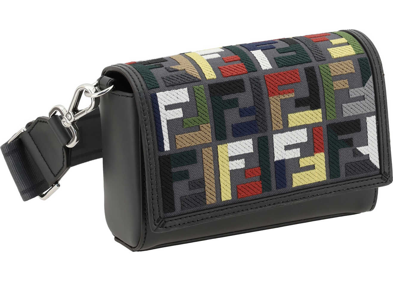 Fendi's Compact Shoulder Bag is an elegant and distinctive accessory made of canvas with the iconic FF motif embroidered in multicolor thread, giving it a dynamic and sophisticated look. Leather details add a luxurious touch to the design. The front magnetic flap closure provides convenience and security. The bag features an exterior flat pocket for easy access to essentials and an interior compartment for better organization. The technical fabric shoulder strap, finished with Fendi lettering, is adjustable and removable.