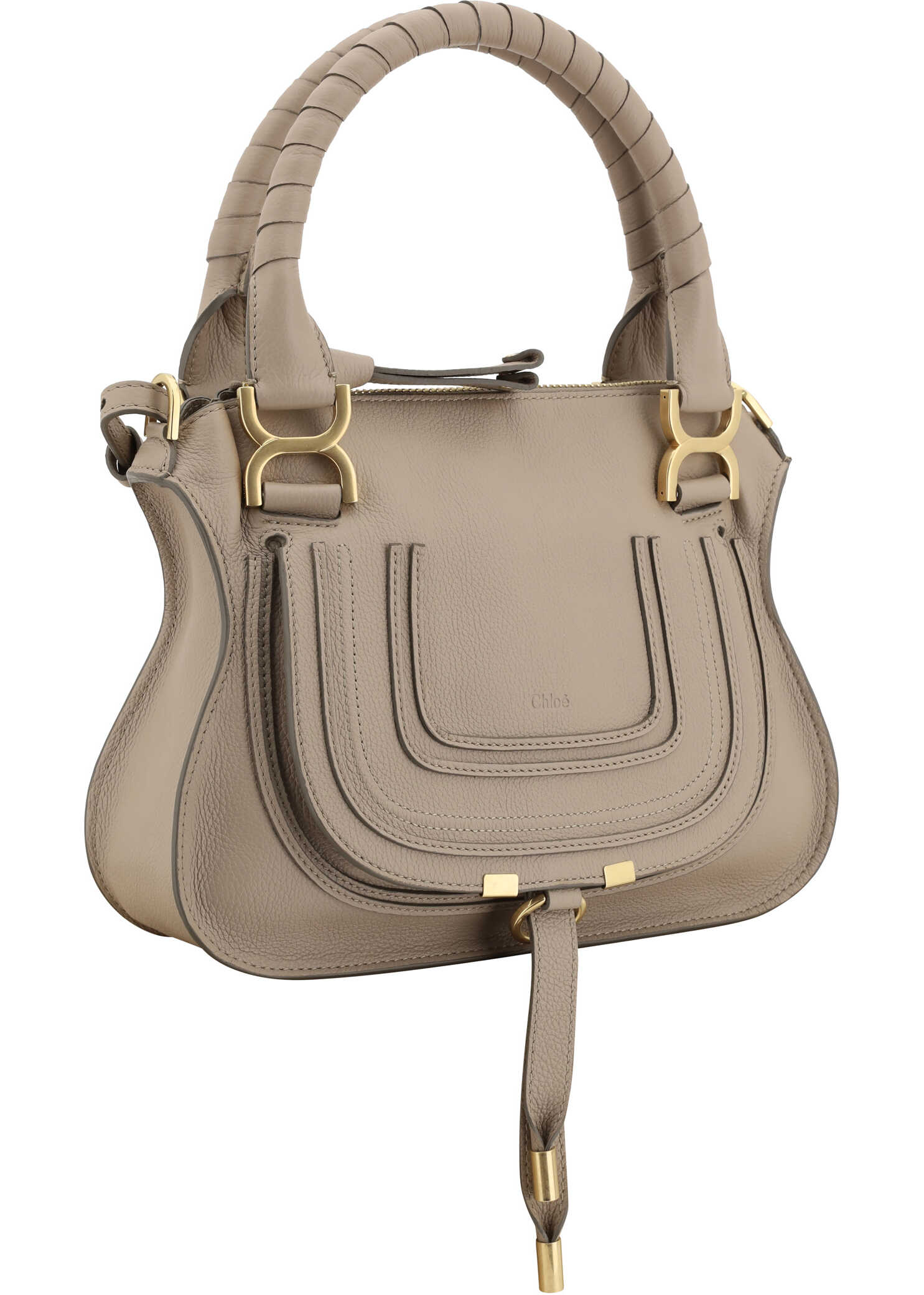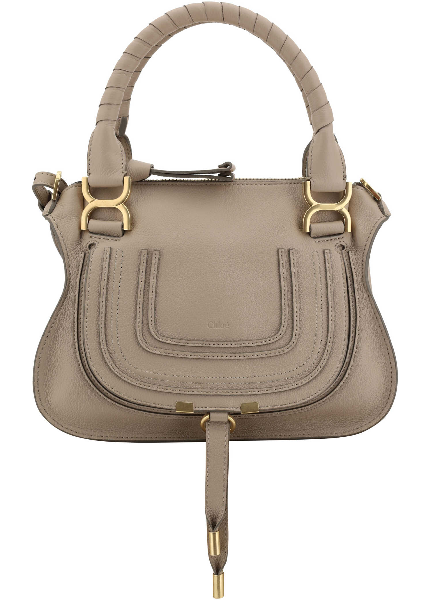 Calfskin Marcie Handbag by Chloé, double rigid leather top handle, removable and adjustable leather shoulder strap, top zipper closure, front flap with iconic leather tassel detail, iconic brand monogram press-stamped on front, open front pocket hidden by flap, single interior compartment.