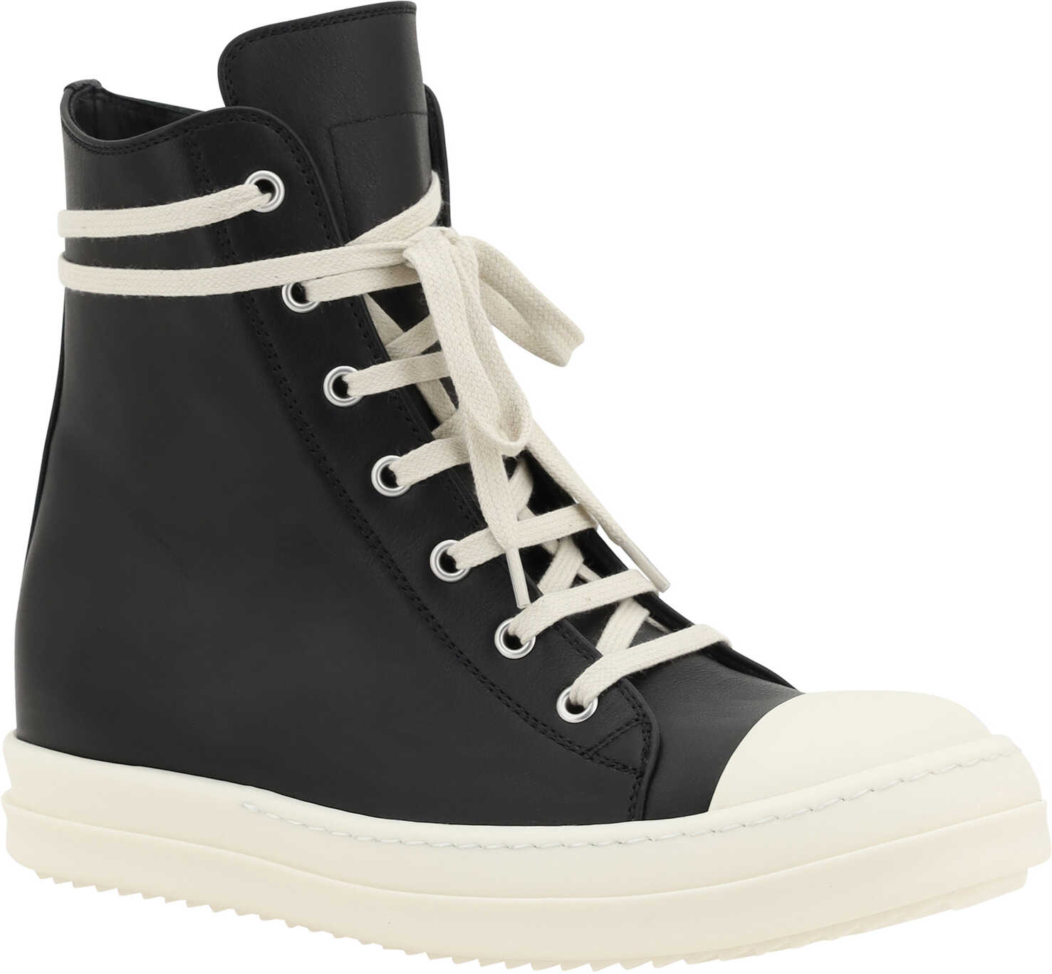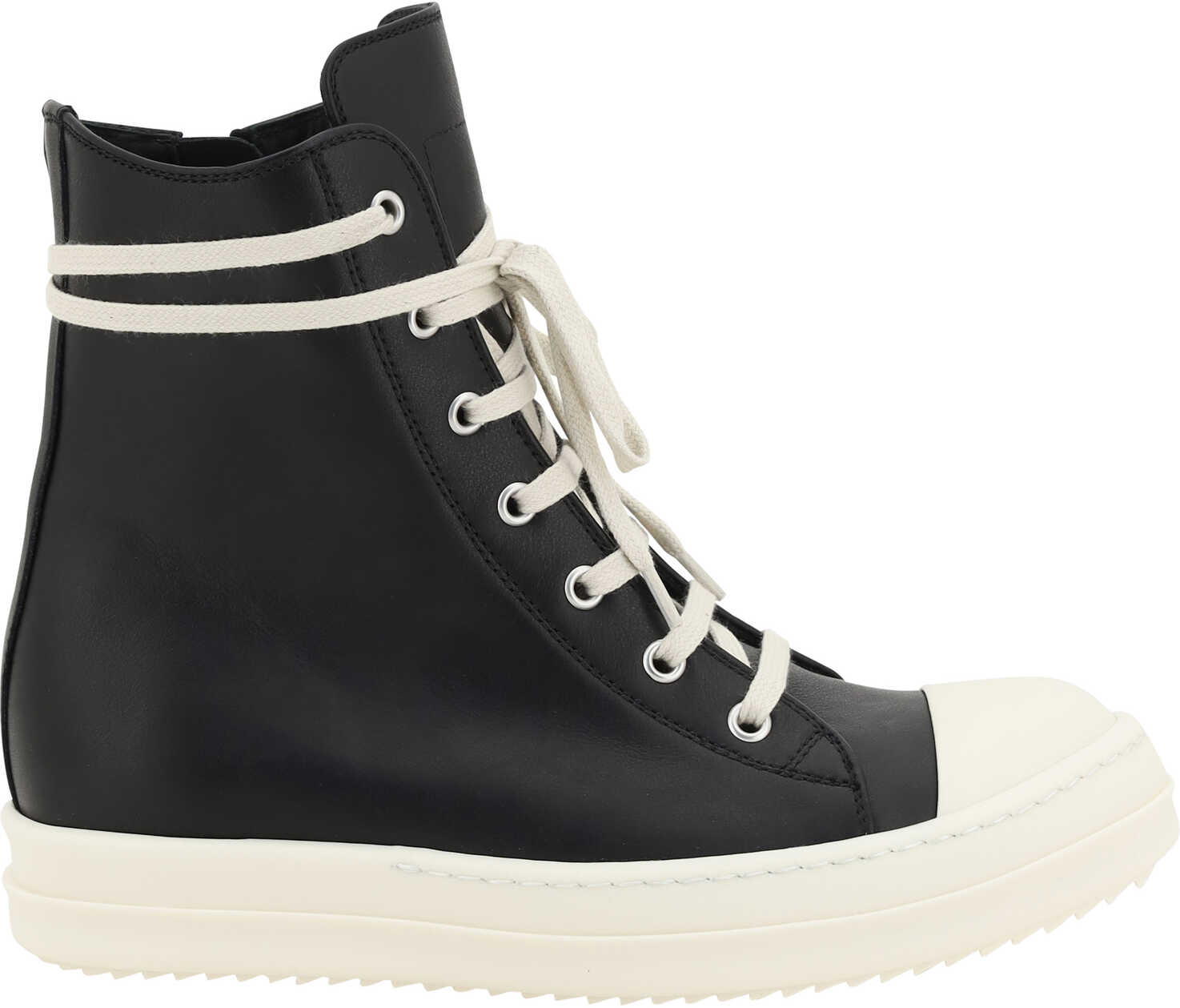 Rick Owens' Leather Sneakers offer a modern, minimalist look. The above-ankle style features a rubber-reinforced round toe for durability and comfort. The flat sole lends stability, while the monochromatic fabric design lends a touch of understated elegance. The front lace-up and side closure via a zipper add practicality, completing a versatile and contemporary pair of sneakers perfect for those seeking a sophisticated yet casual style.