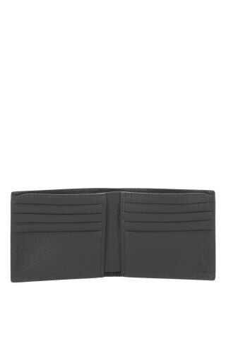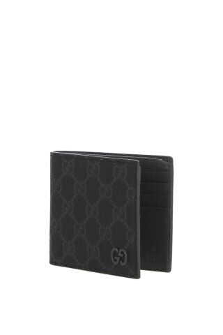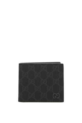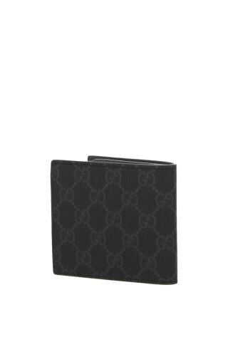 Gucci bi-fold wallet crafted from black and gray GG Supreme canvas. The interior, lined with grained leather and fabric, features two bill compartments, two flat pockets and eight card slots. The design is finished with the iconic GG metal detail.