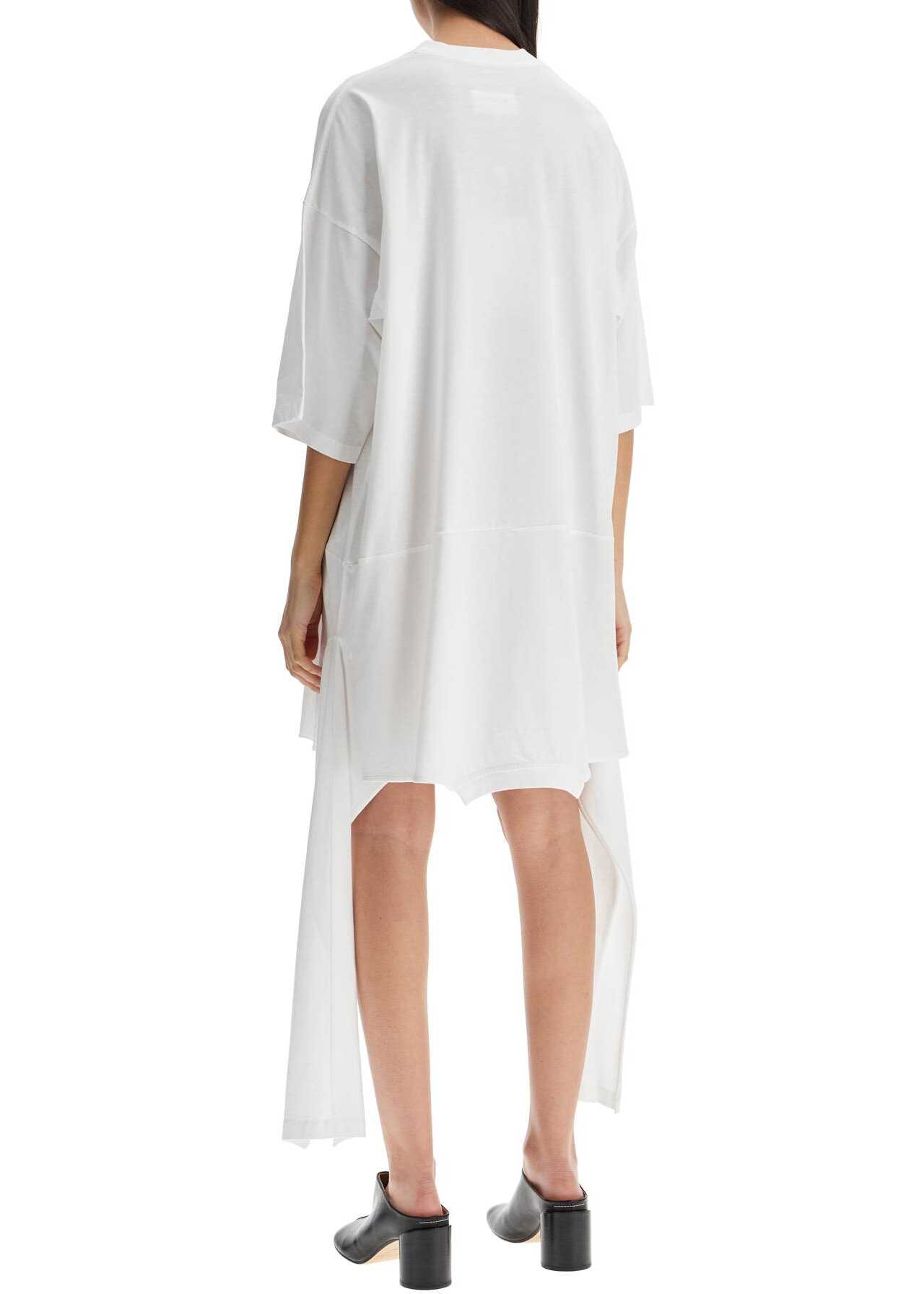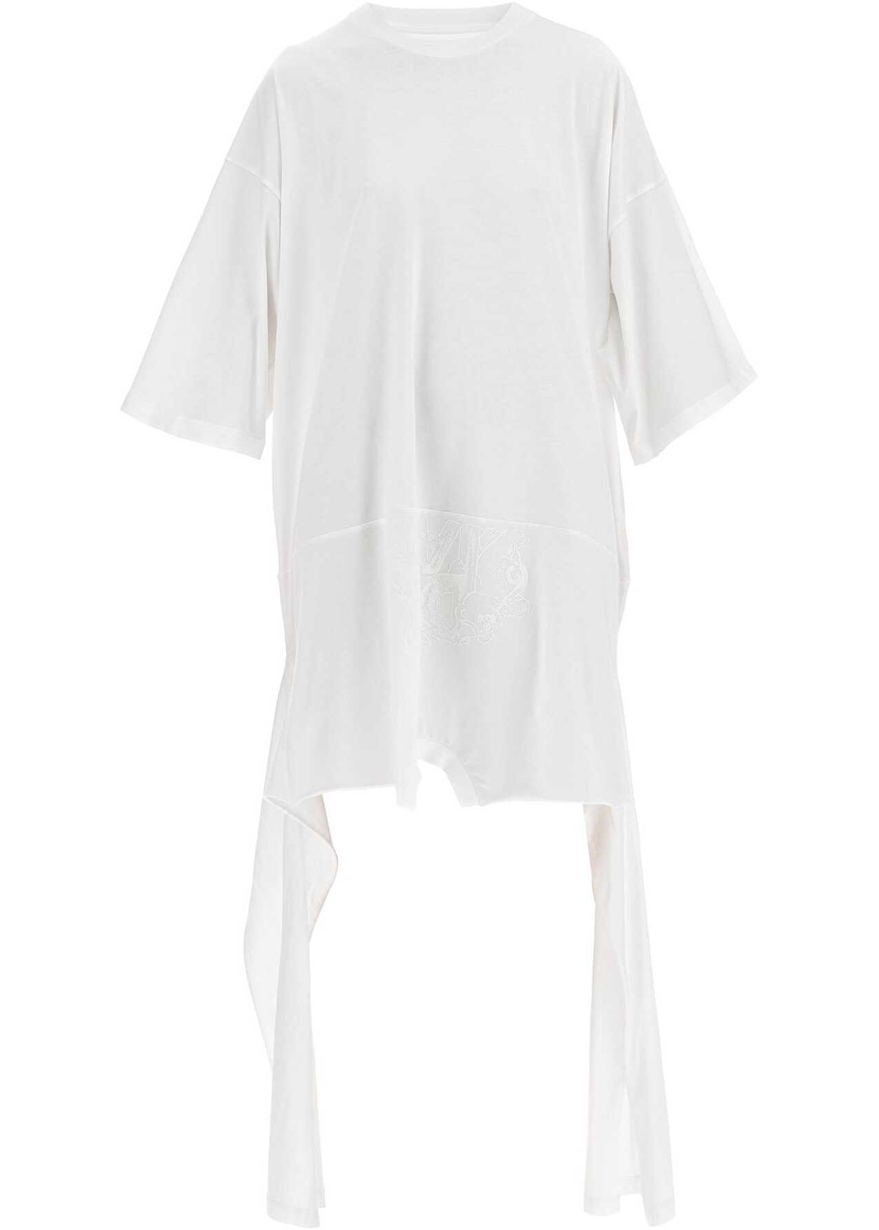 The MM6 Maison Margiela mini dress has an oversized look with short sleeves, made of pure cotton jersey. It features a bottom that replicates a crew neck t-shirt with flocked graphic print and long sleeves to tie around the waist for a layered effect. The model is 177 cm tall and wears size S.