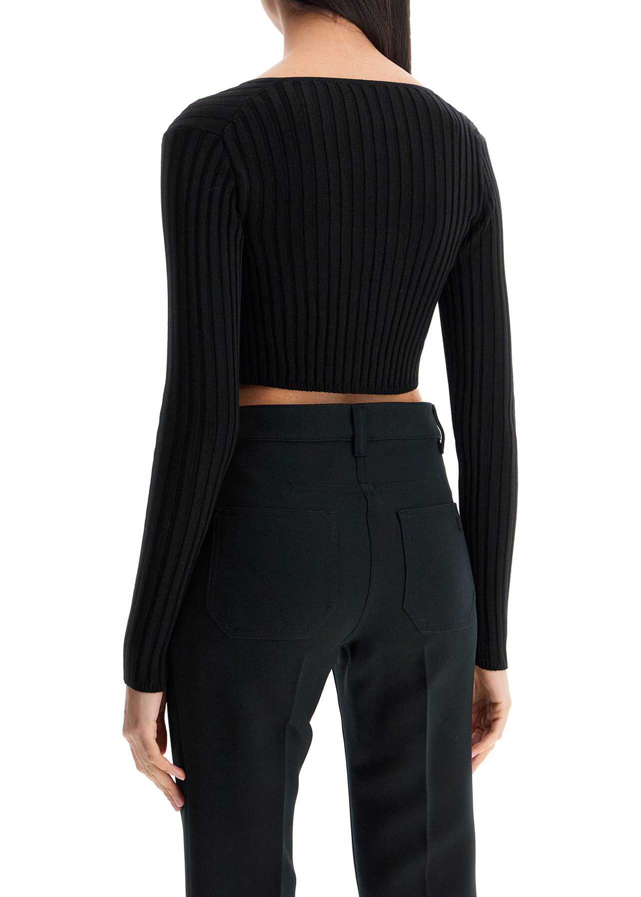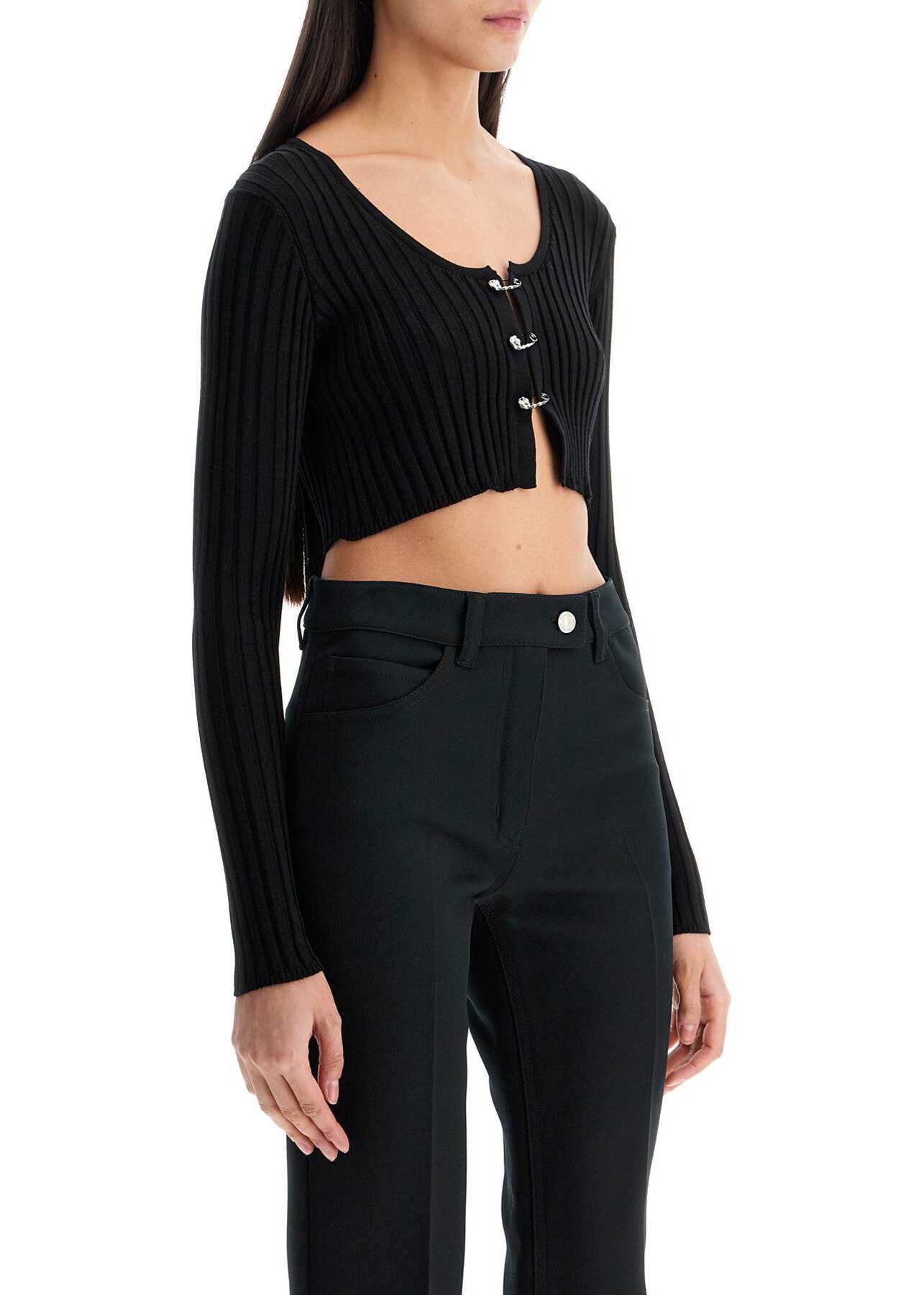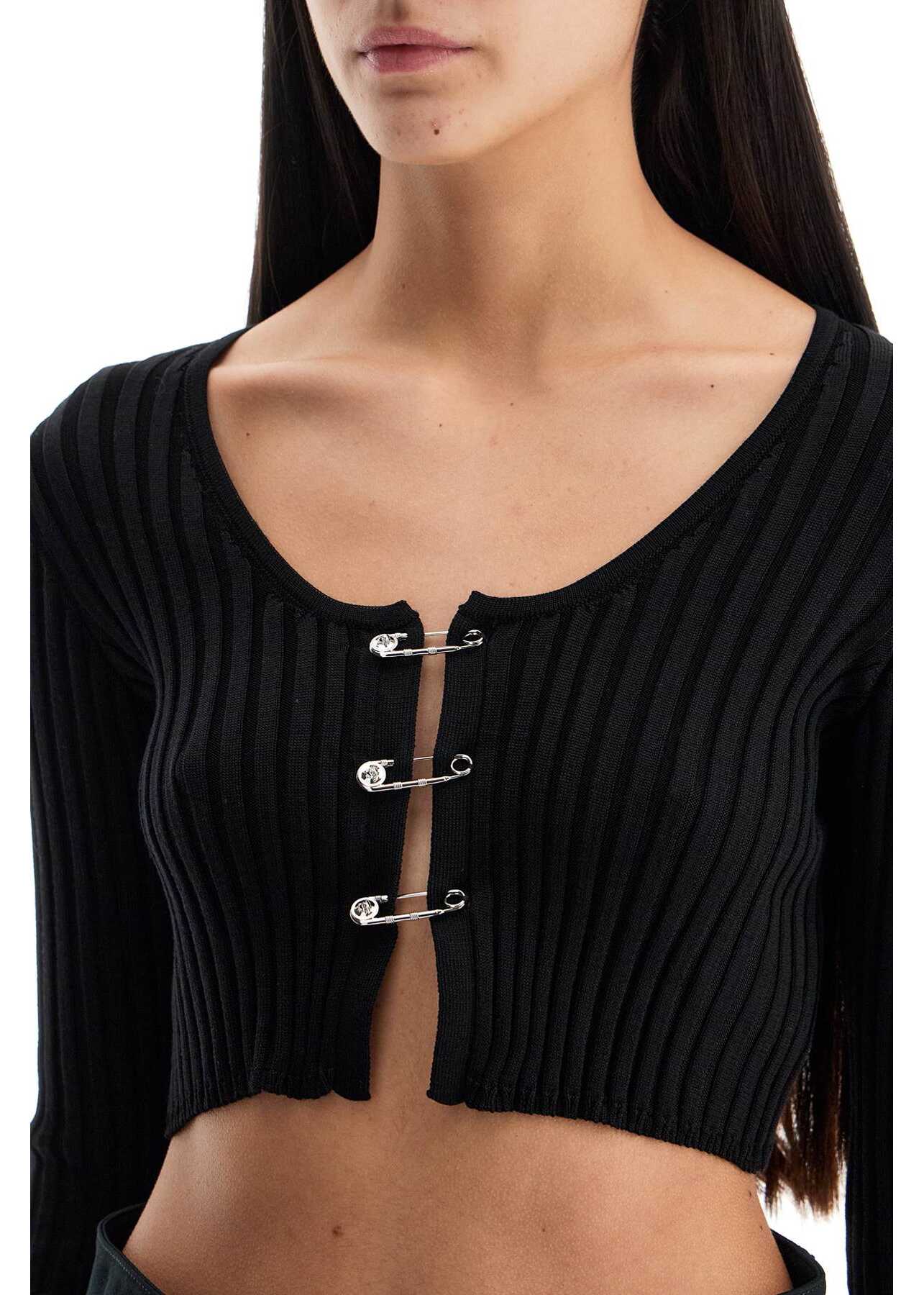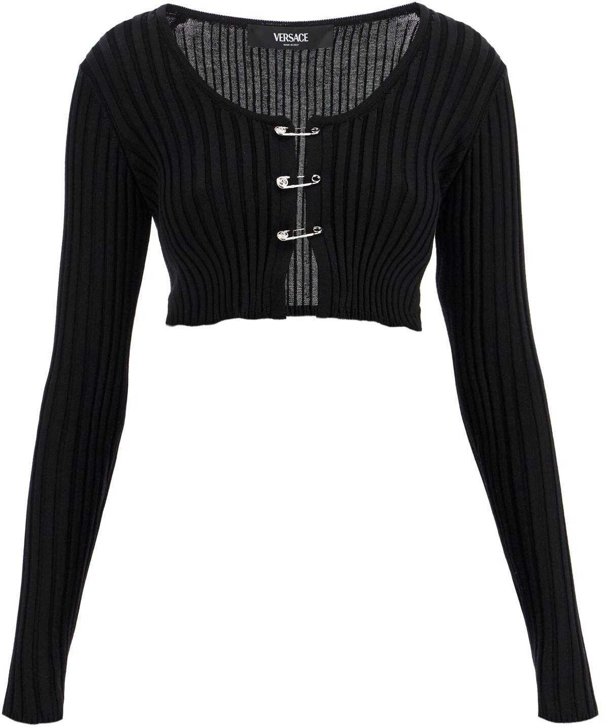Crafted in a ribbed knit of wool and viscose, this Versace cardigan stands out for its fitted silhouette with a cropped hem, wide round neckline, and closure with three Safety Pins. The model is 177 cm tall and wears size IT 38.