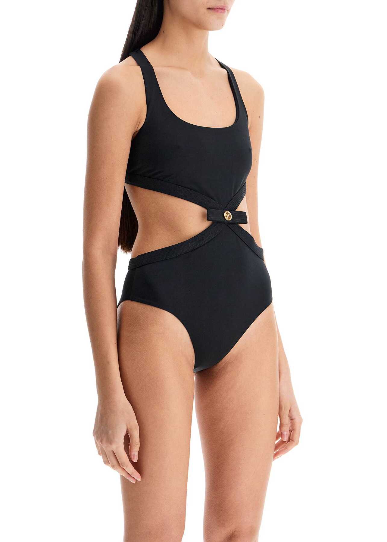 This Versace one-piece swimsuit is made of lycra and decorated with the iconic 'Gianni ribbon', complete with a golden Medusa appliqué on the front. It features a cut-out design with a deep neckline at the front and a racerback style at the back. The high-cut bottom is lined for comfort. The model is 177 cm tall and wears an IT size 2.