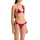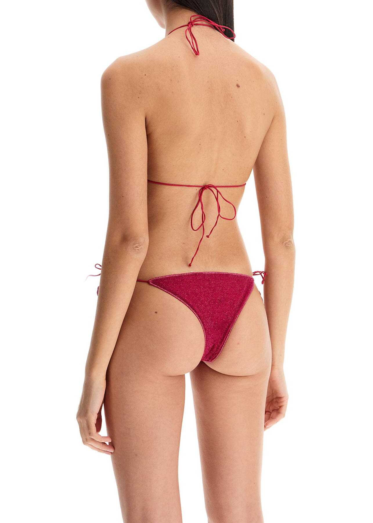 This lurex lycra bikini set from Oséree is composed of a triangle top and low-waisted, high-cut bottoms with minimal coverage, embellished with rose-shaped appliqués. Both pieces are adjustable with thin ties at the neck, back, and hips. The model is 177 cm tall and wears size S.