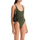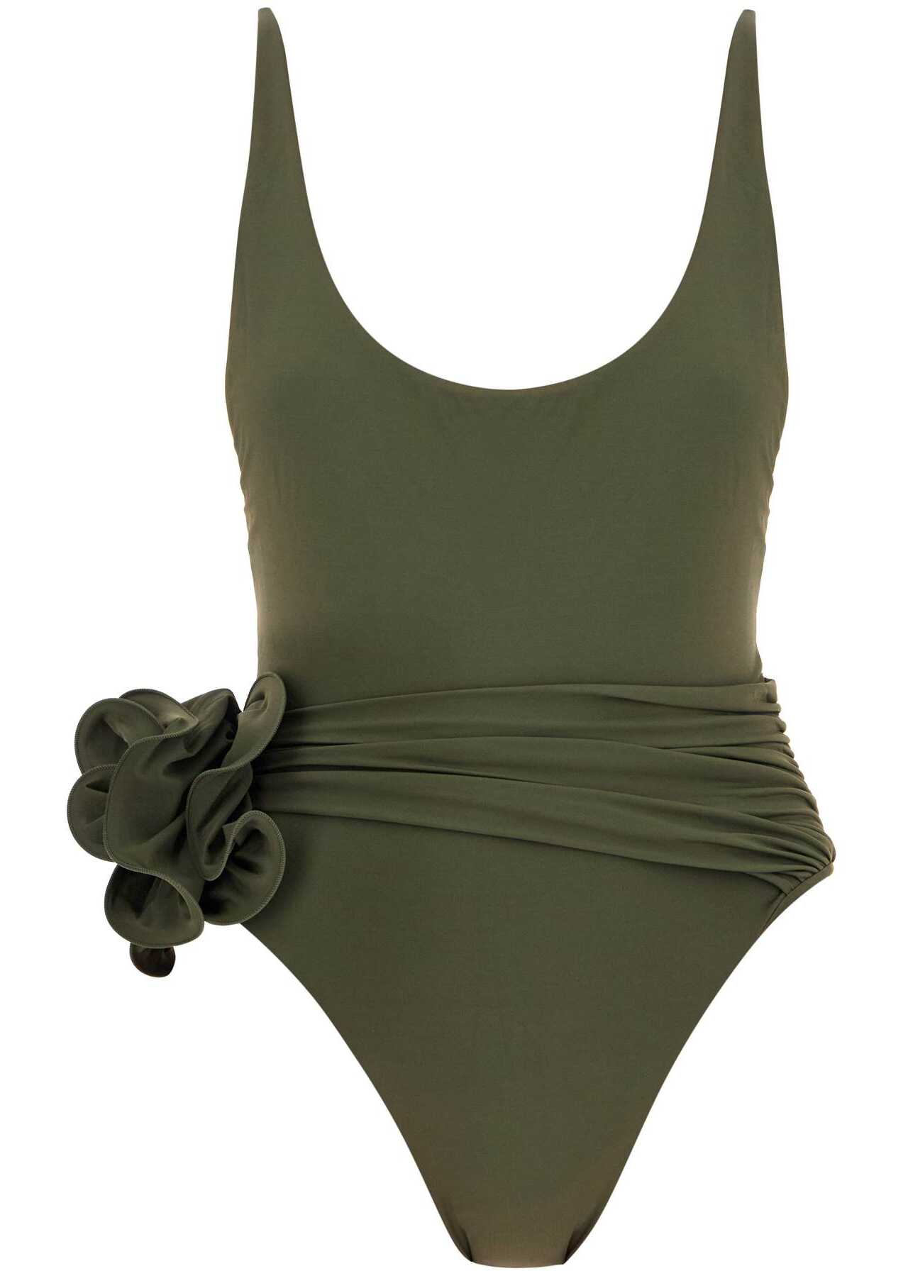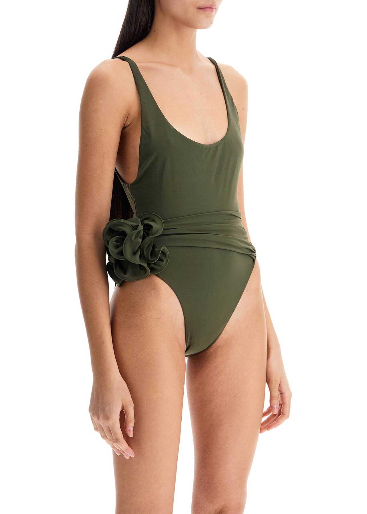The Magda Butrym one-piece swimsuit is made of stretchy lycra and features a waistband with a large flower appliqué. It has high-cut bottoms, a wide neckline, and adjustable straps. The model is 177 cm tall and wears a size FR 36.