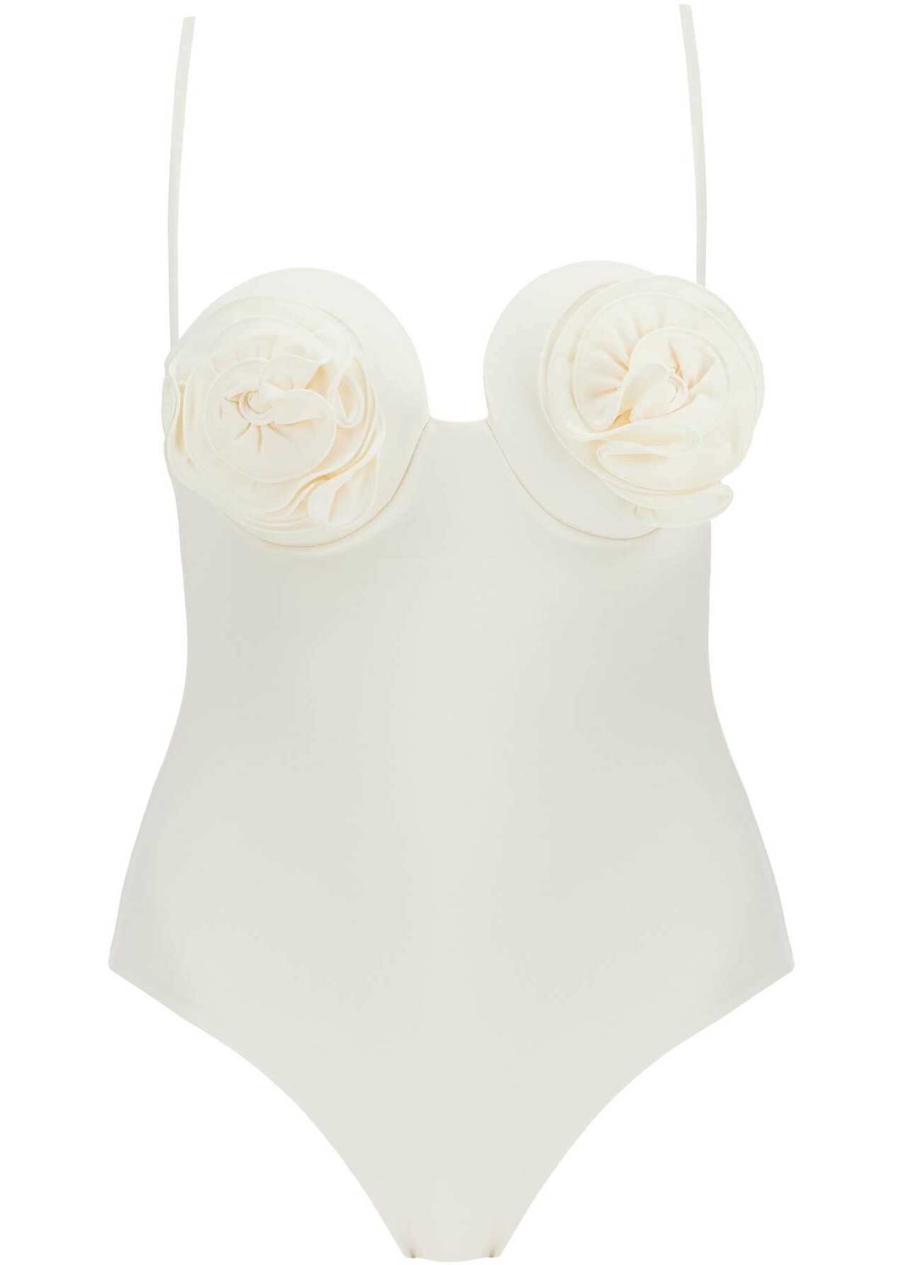 This one-piece swimsuit by Magda Butyrm is made of lycra and adorned with flower appliques on each rigid cup. It features adjustable straps and a high-cut design. The model is 177 cm tall and wears a size FR 36.