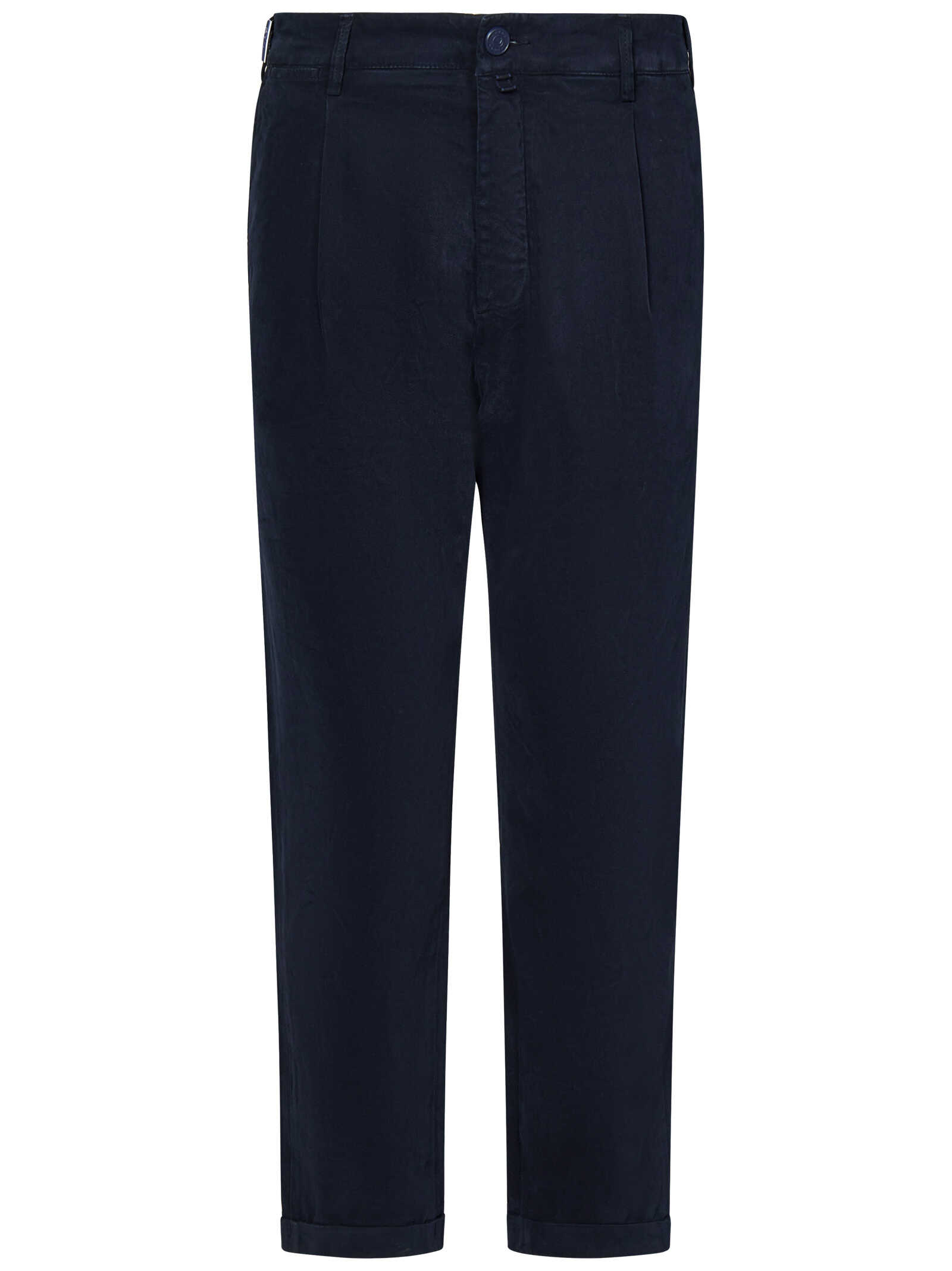 Henry cropped slim fit jeans in navy blue cotton denim with pleats on the front.