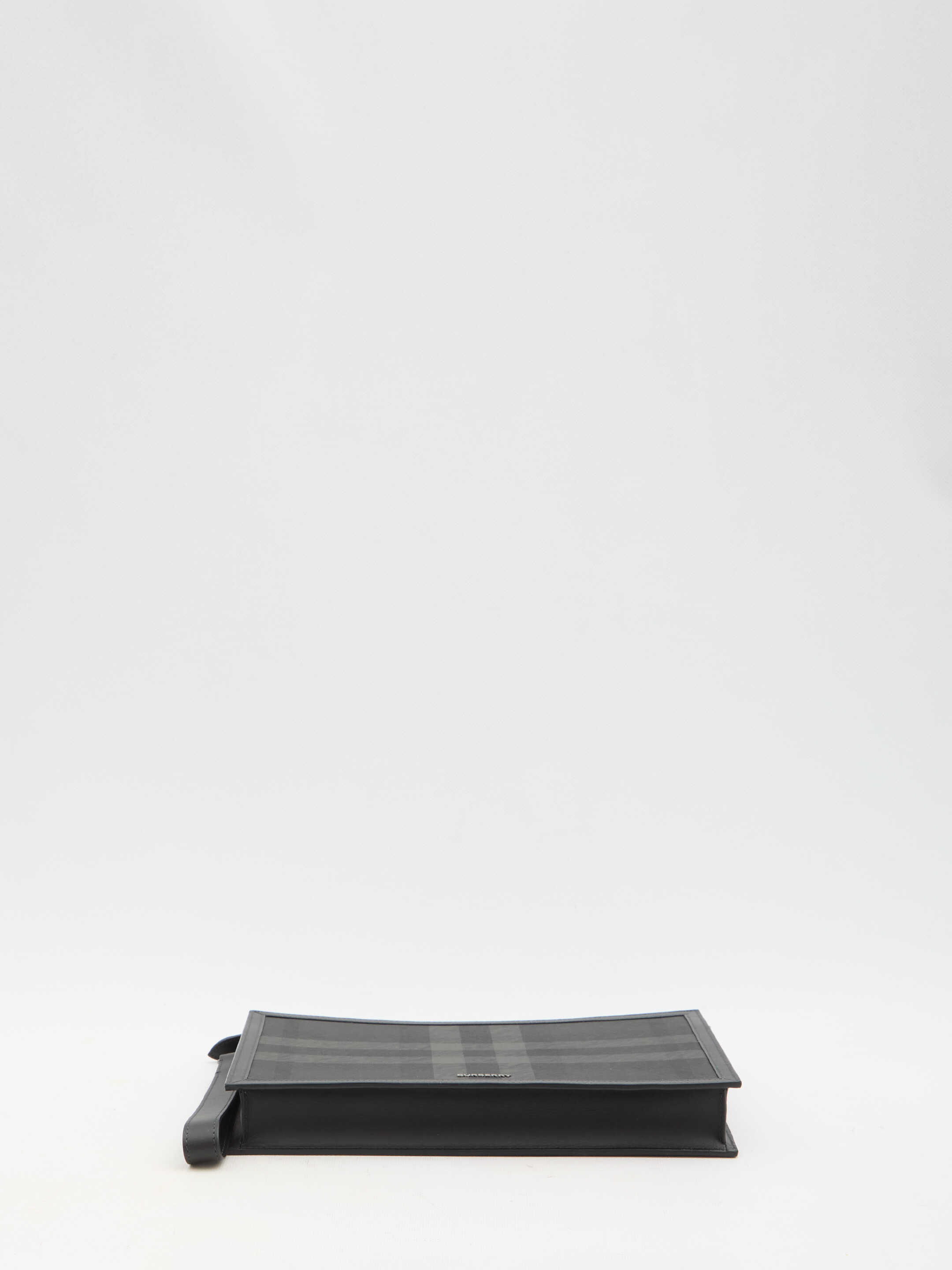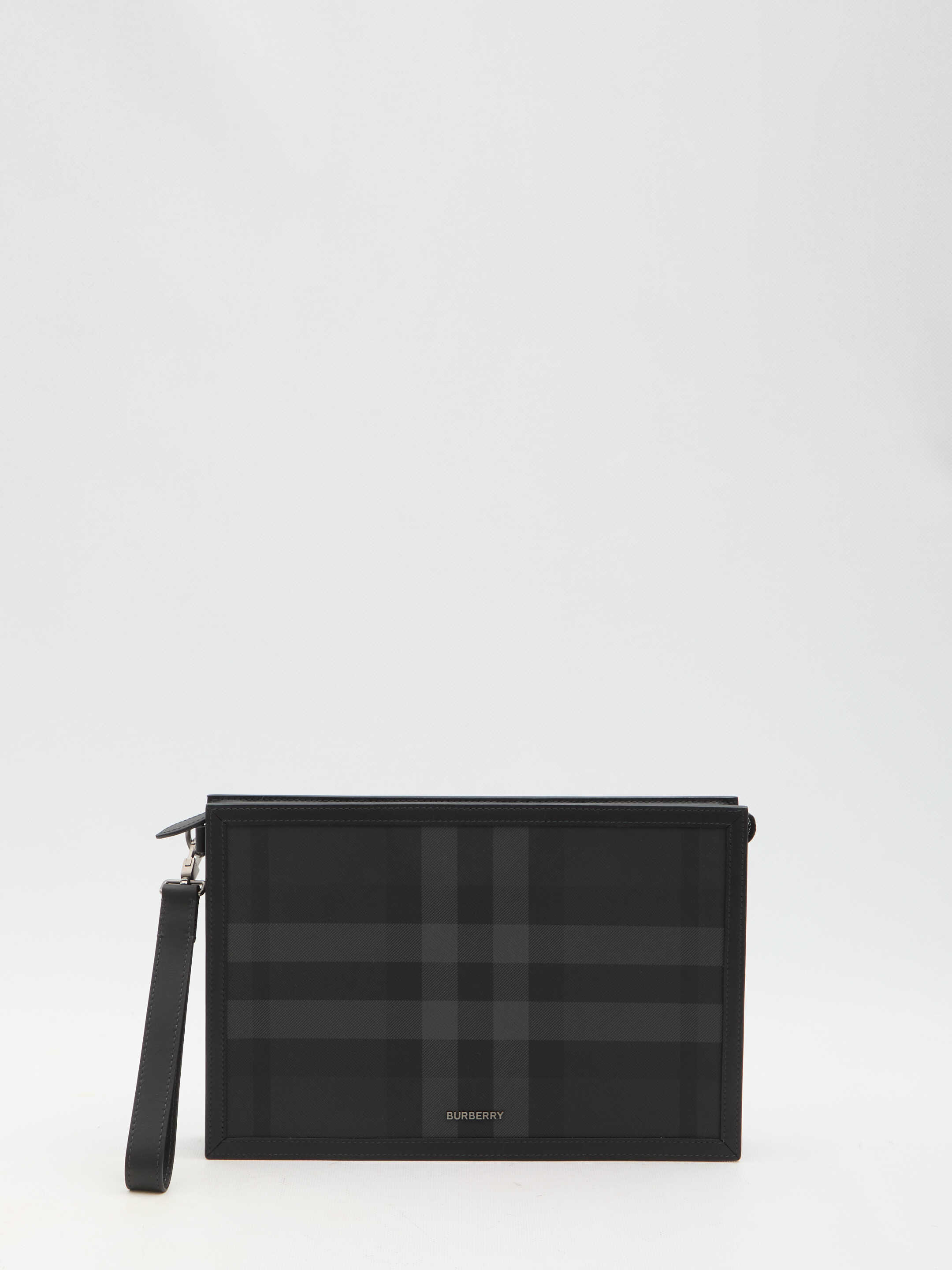 Pouch in black and dark grey Burberry Check with leather trim. It features zipper closure, detachable wrist strap, raised Burberry lettering on the front and one main internal compartment. Dust bag included. Any leather imperfections are not to be considered manufacturing defects, but a peculiarity of the material.