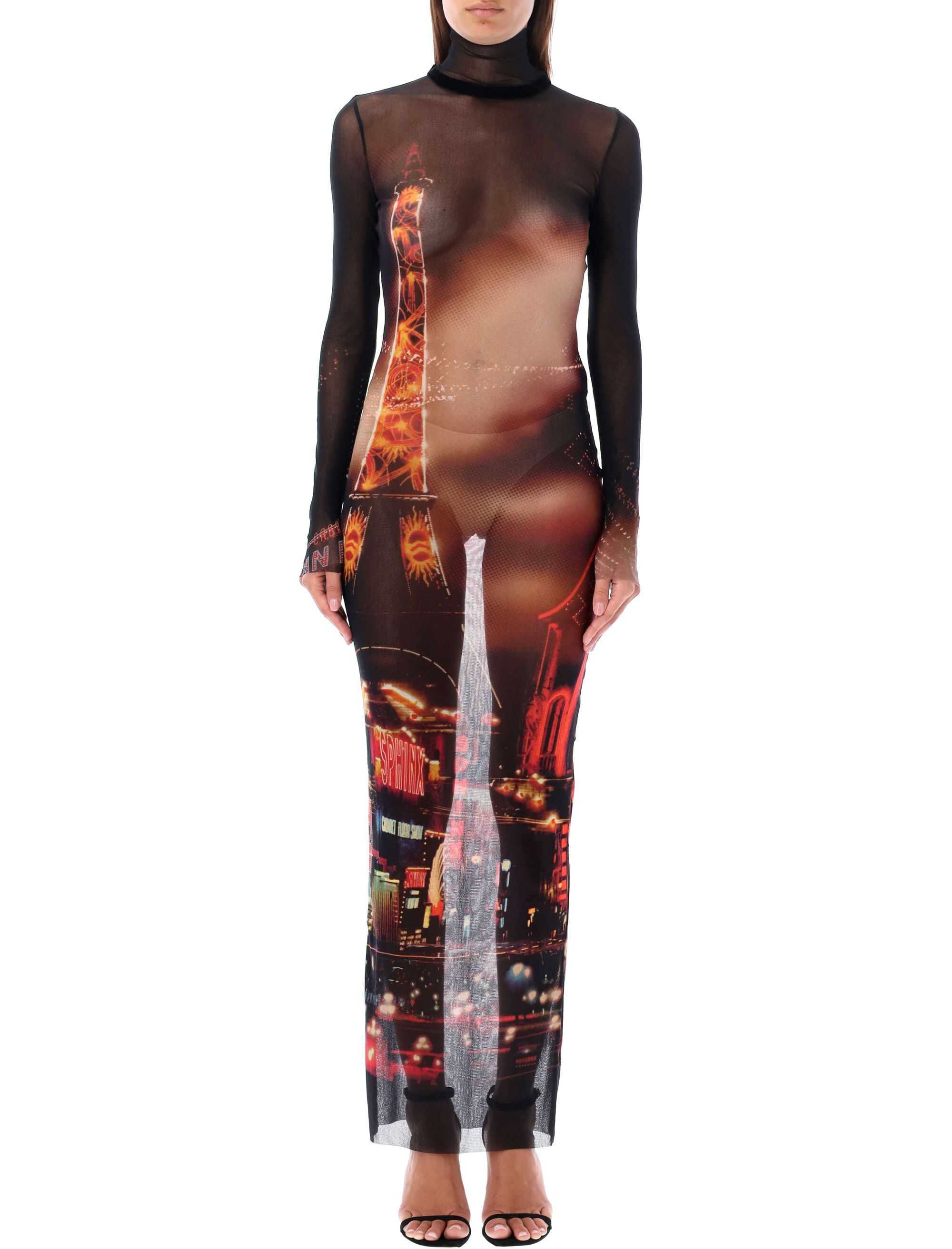 Stand out in style with this stunning Turtle neck mesh dress Pigalle by Jean Paul Gaultier. Made from 100% polyamide, the dress features a vibrant Black, Red, and Orange print, a high turtleneck collar, and a slim fit silhouette. Perfect for making a statement at any event, this floor-length dress is sure to turn heads. Get yours today and elevate your wardrobe with this eye-catching piece!