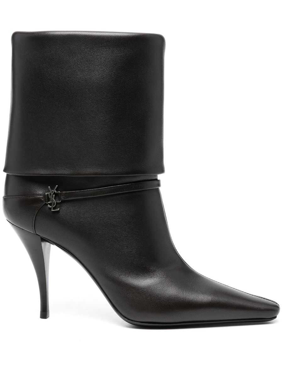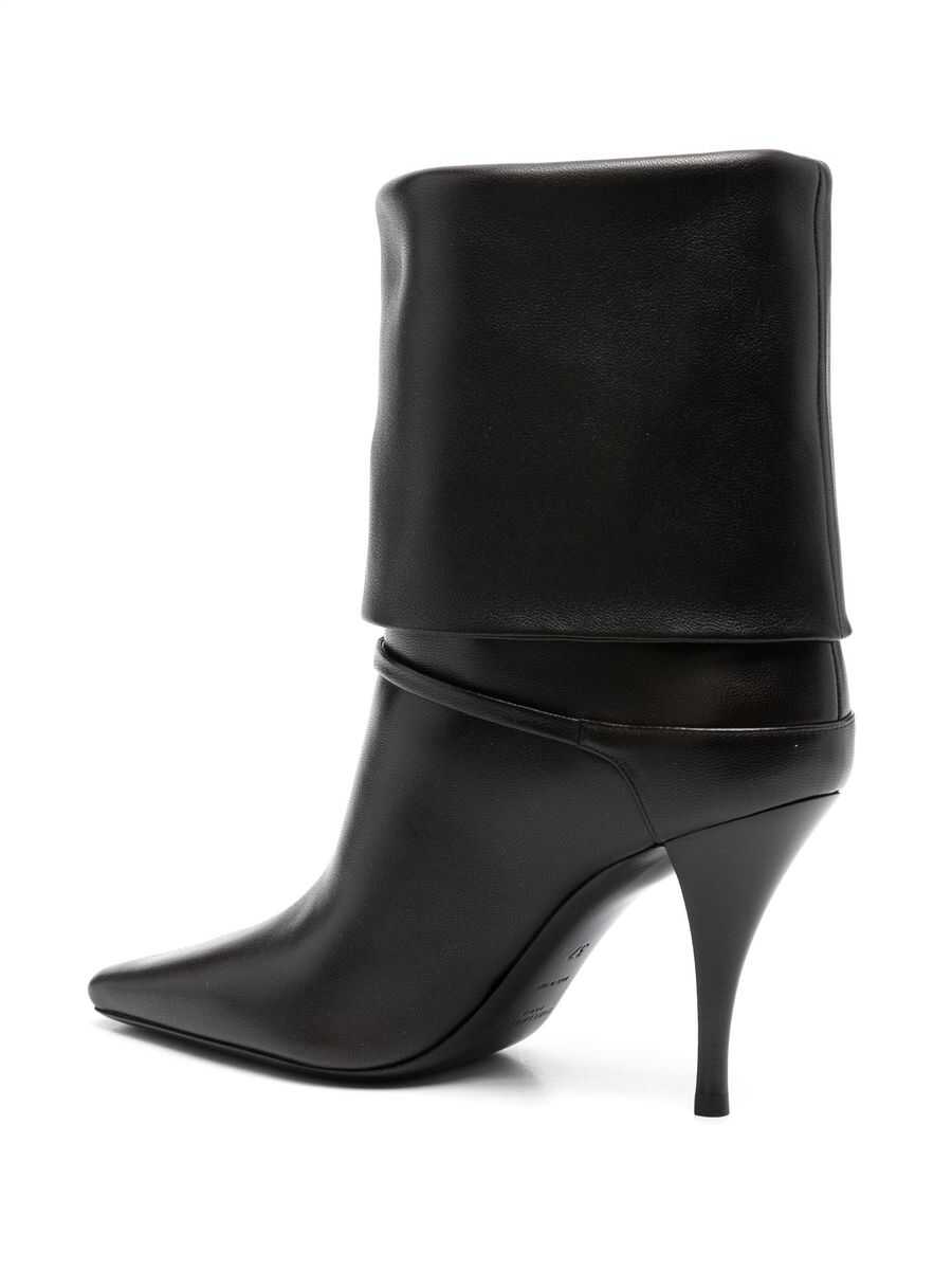 coffee brown calf leather smooth grain folded design slip-on style 85mm high stiletto heel strap detailing appliqué logo square toe branded leather insole leather sole ankle-length