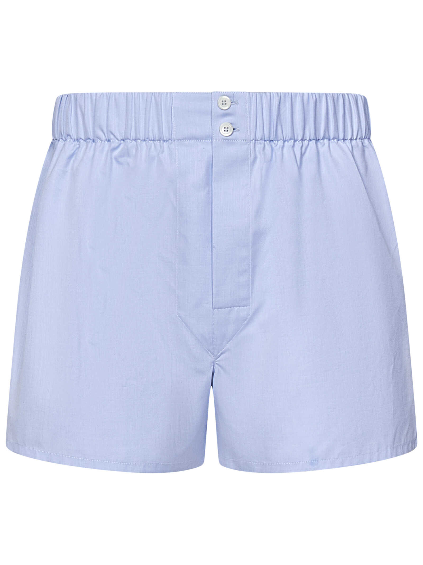 Light blue cotton boxer shorts with elasticated waistband and mother-of-pearl buttons.