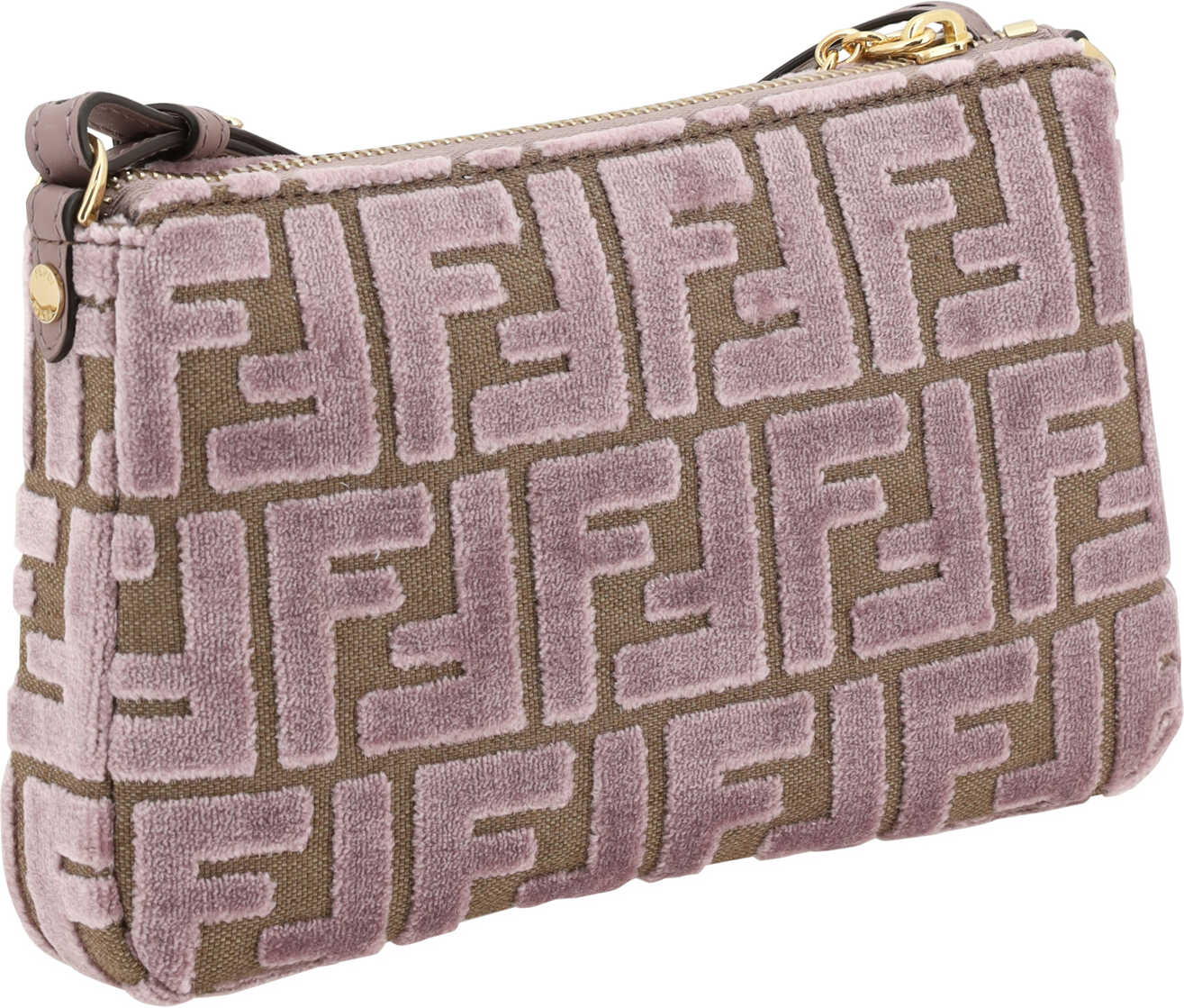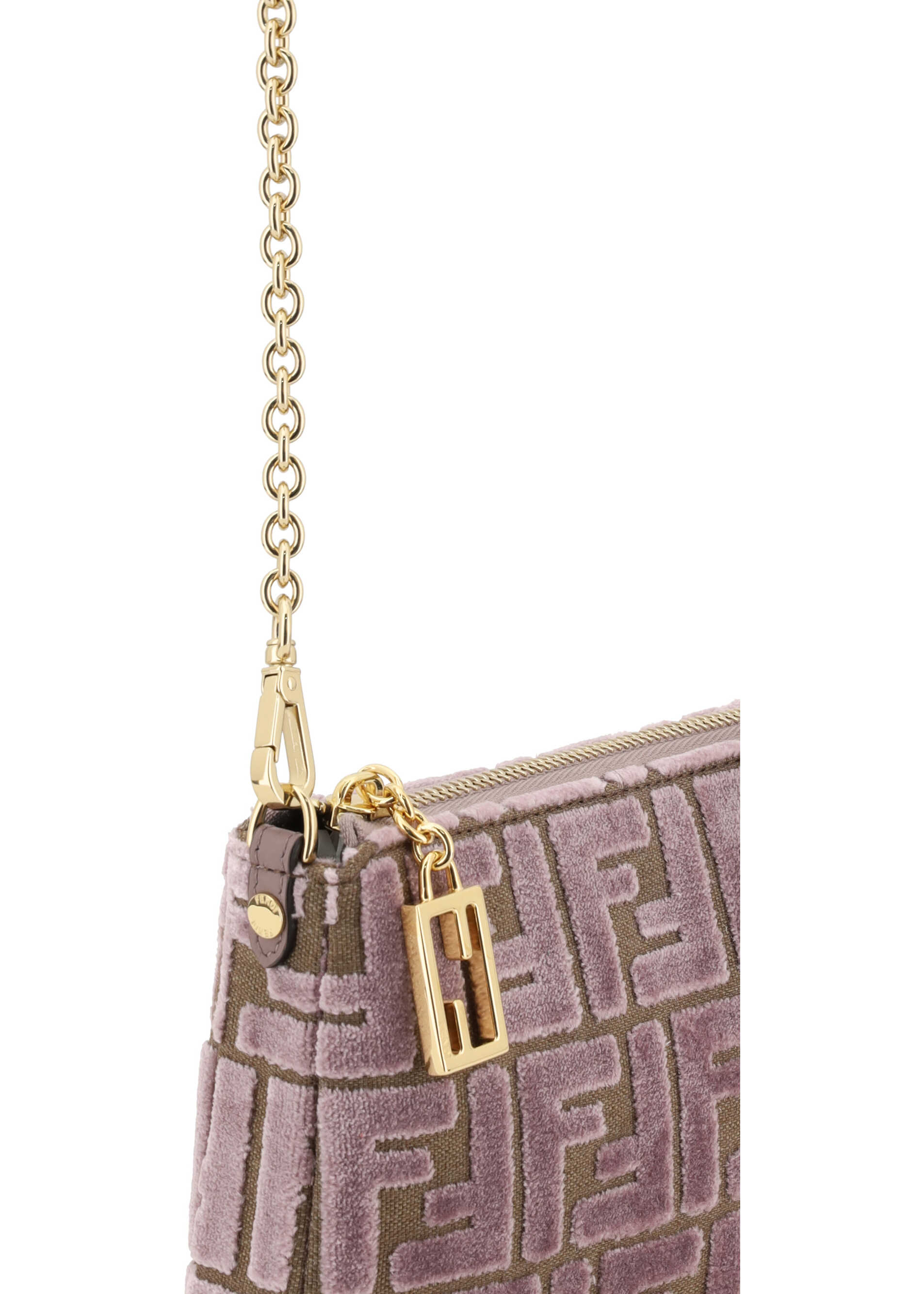 Fendi's monogram FF Clutch Bag is an elegant accessory made of soft, luxurious velvet with the brand's signature FF pattern covering the entire surface. The zippered top closure keeps items secure, while the removable chain strap adds a touch of sophistication and versatility, allowing it to be carried on the shoulder or crossbody. Inside, a single compartment offers convenient storage for your essentials.