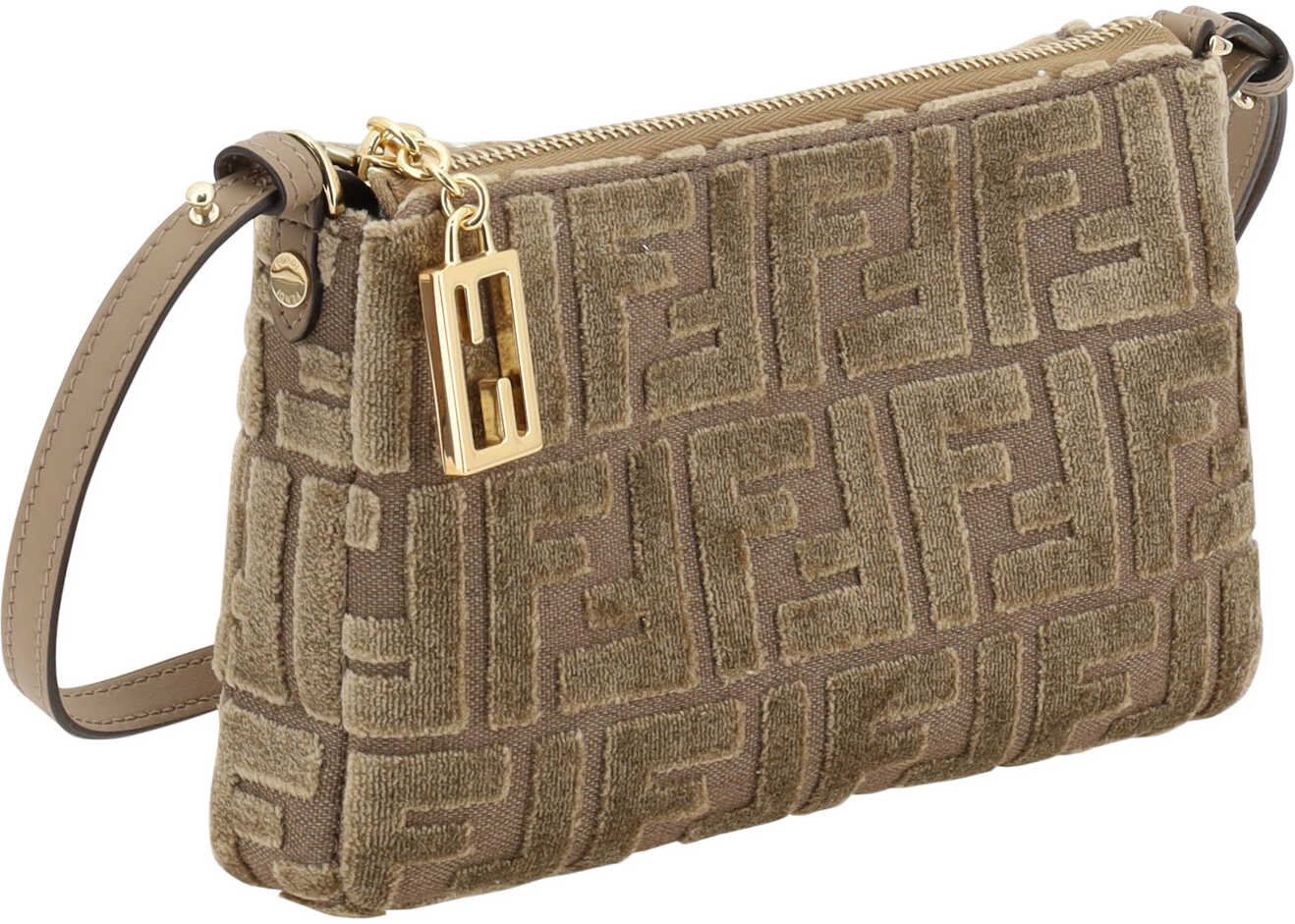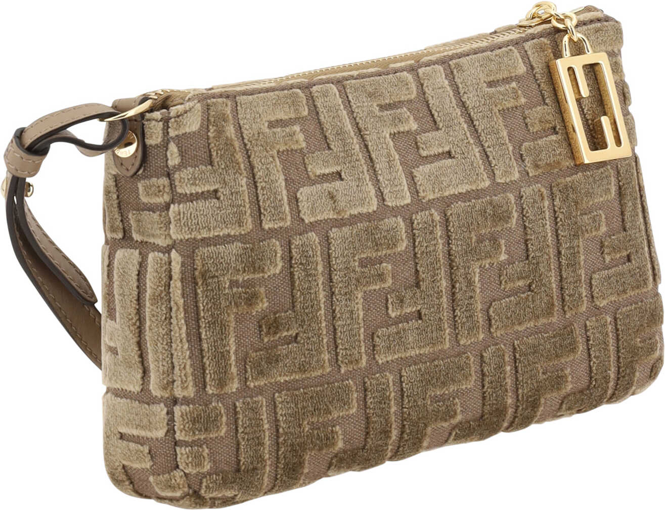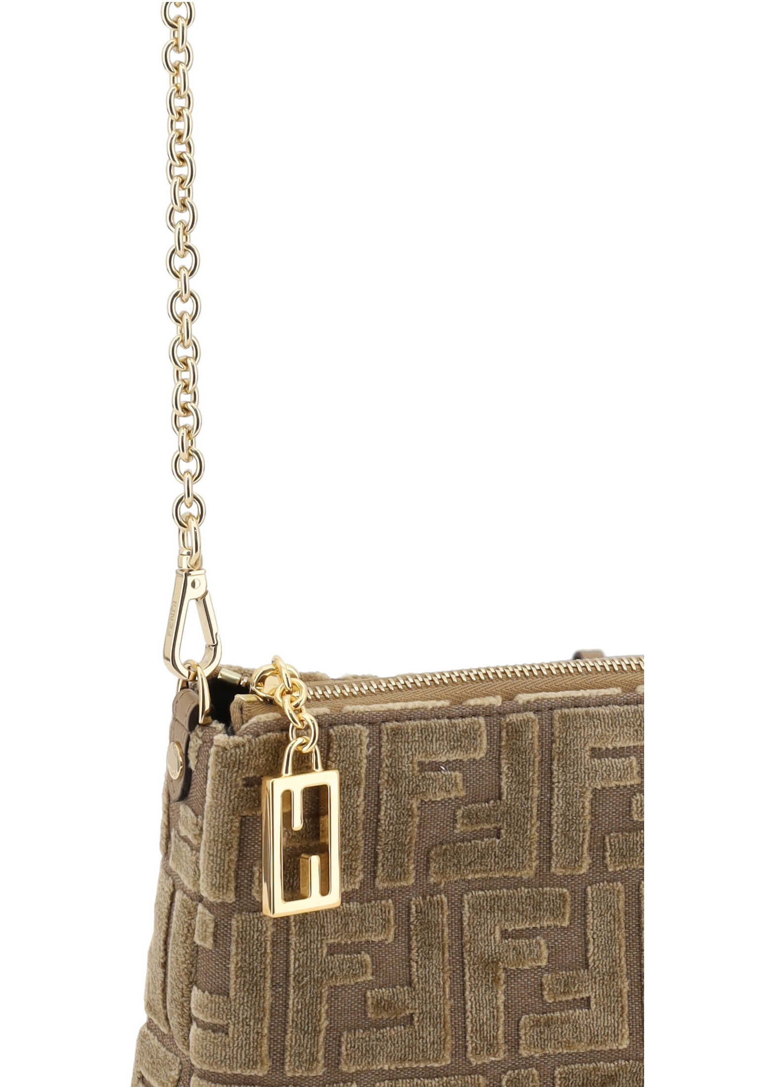 Fendi's monogram FF Clutch Bag is an elegant accessory made of soft, luxurious velvet with the brand's signature FF pattern covering the entire surface. The zippered top closure keeps items secure, while the removable chain strap adds a touch of sophistication and versatility, allowing it to be carried on the shoulder or crossbody. Inside, a single compartment offers convenient storage for your essentials.