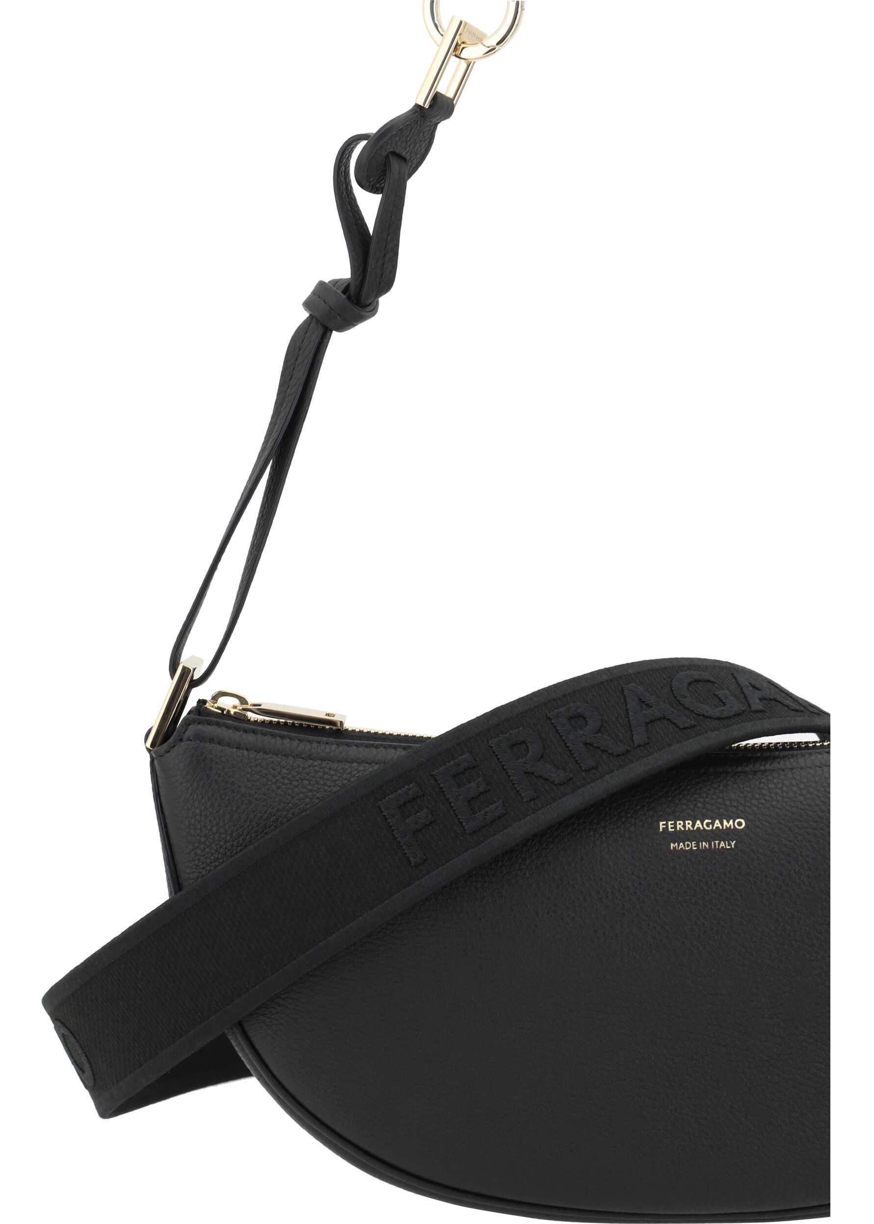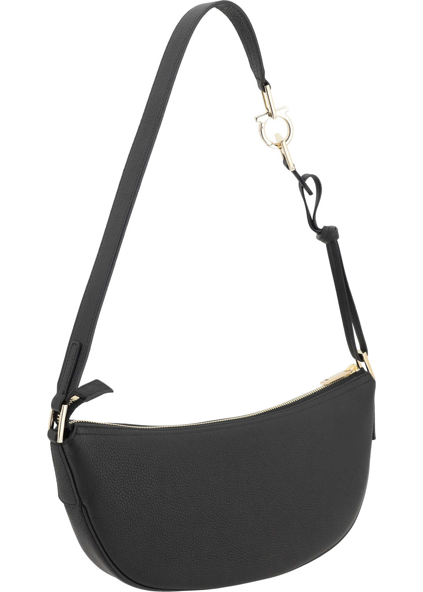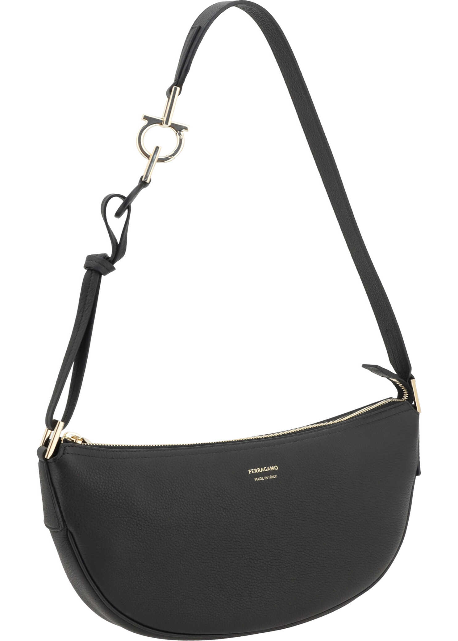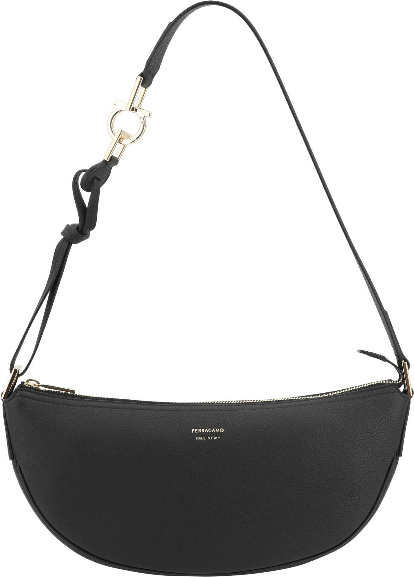 Ferragamo's Leather Hobo Shoulder Bag is an elegant and versatile accessory, featuring a half-moon design that enhances its soft, flowing silhouette. The adjustable shoulder strap allows you to easily adjust it to your desired length for optimal comfort. The zippered top closure provides security and convenience, while the brand's iconic monogram printed on the front adds a distinctive and sophisticated touch. Made of grained leather, the bag offers a refined yet durable look, perfect for completing both casual and more elegant outfits.