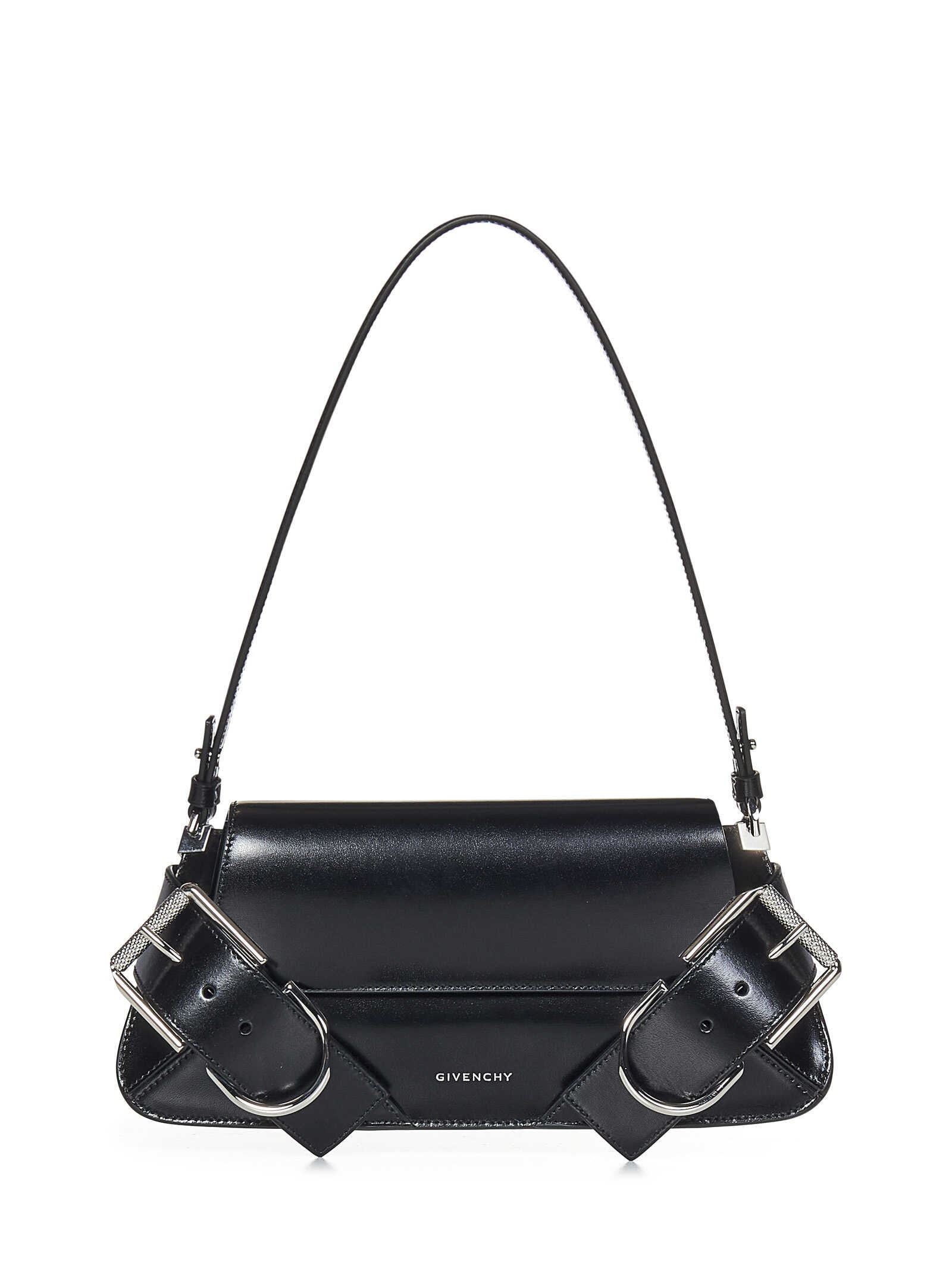 Voyou Small shoulder bag in black Box calfskin with oversized silver logo-engraved buckles.