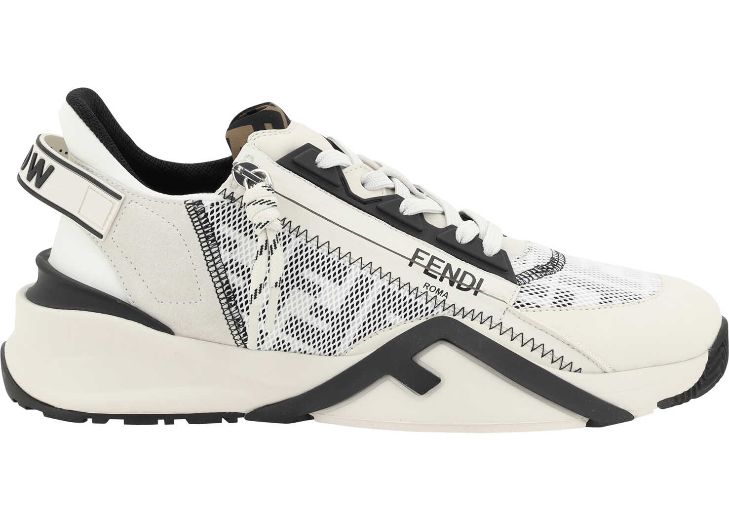 Fendi's Flow leather Sneakers are a bold and contemporary design that combines comfort and luxury. With a textured sole, these sneakers offer excellent grip and stability. The elongated toe gives a sleek look, while the side panels, decorated with the brand's embossed FF print, emphasize Fendi's identity in an elegant way. The contrasting panel design creates a dynamic look, while the logo-embossed press-stud label on the tongue and the zipper appliqué on the back of the foot offer practicality and an additional stylistic detail. The front lace-up closure ensures a comfortable and secure fit, complementing the sophisticated design of these sneakers.
