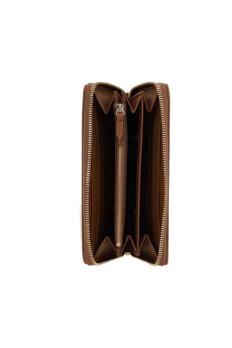 Gucci wallet crafted from GG Monogram fabric with smooth brown leather details. Features gold-tone hardware and a zip-around closure. The fabric-lined interior includes three separate compartments, three flat pockets, a zipped coin pocket, and twelve card slots.