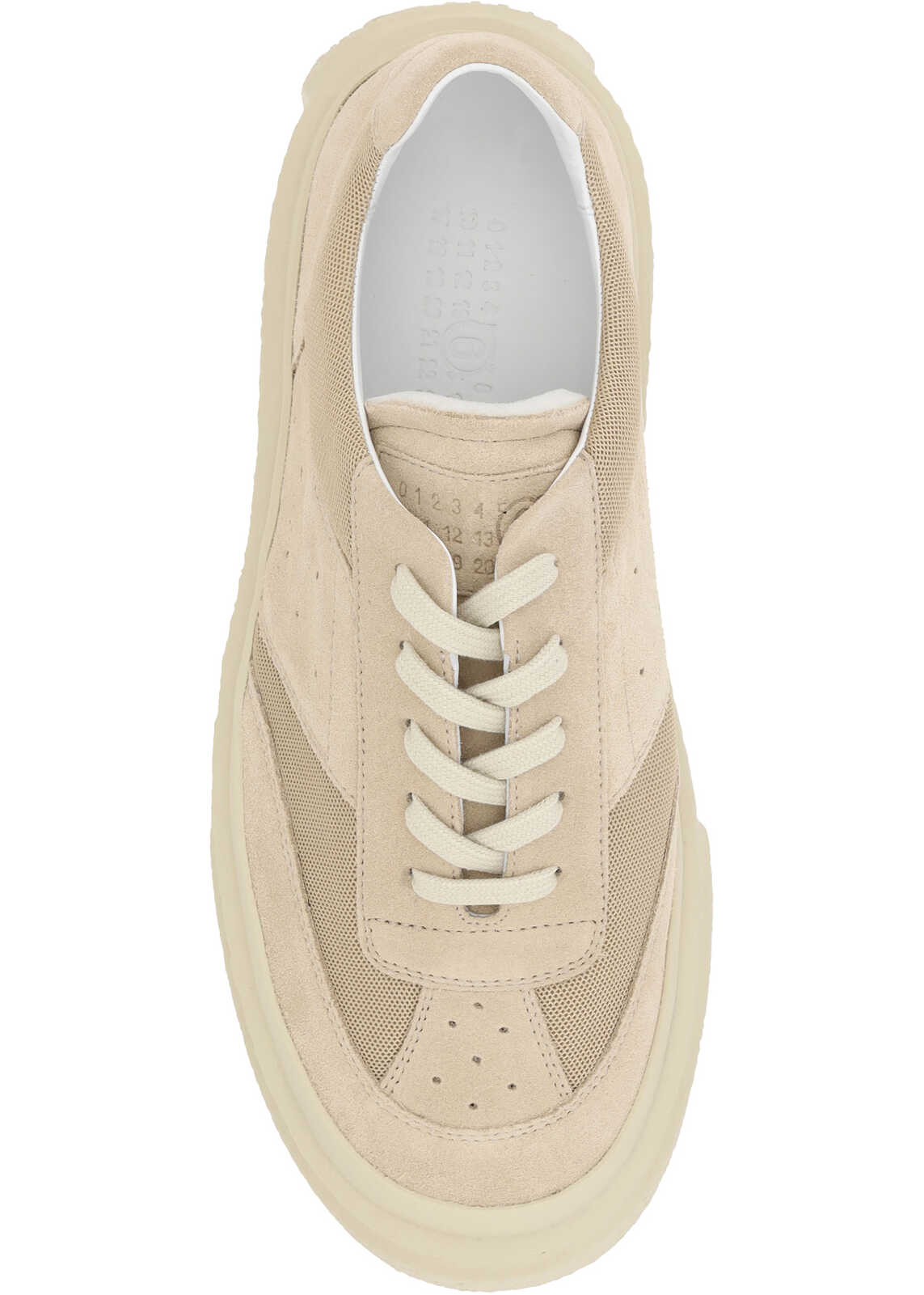 MM6's Chunky Sneakers combine bold and contemporary style, perfect for those seeking a trendy streetwear look. The lace-up closure offers an adjustable fit, while the raised chunky sole adds a touch of comfort and a bold silhouette. The round toe and mesh inserts enrich the design, giving it a dynamic and light touch. The iconic brand logo applied on the back adds a distinctive and recognizable detail.