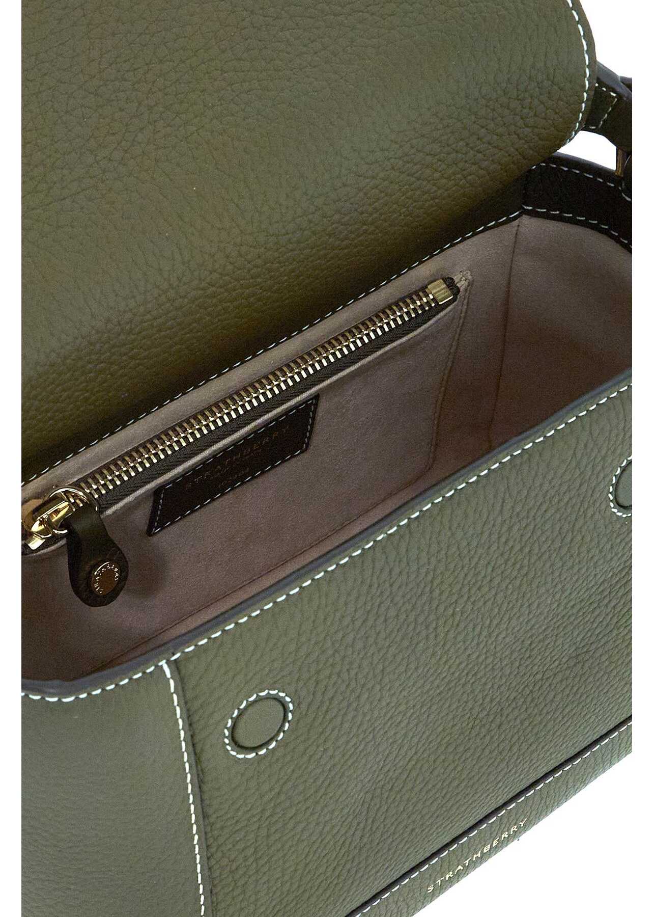 The Strathberry Mosaic Top Handle Bag combines elegance and contemporary design. Made from khaki calf leather, it offers versatility with a handle and adjustable shoulder strap. Perfect for those who love modern luxury.