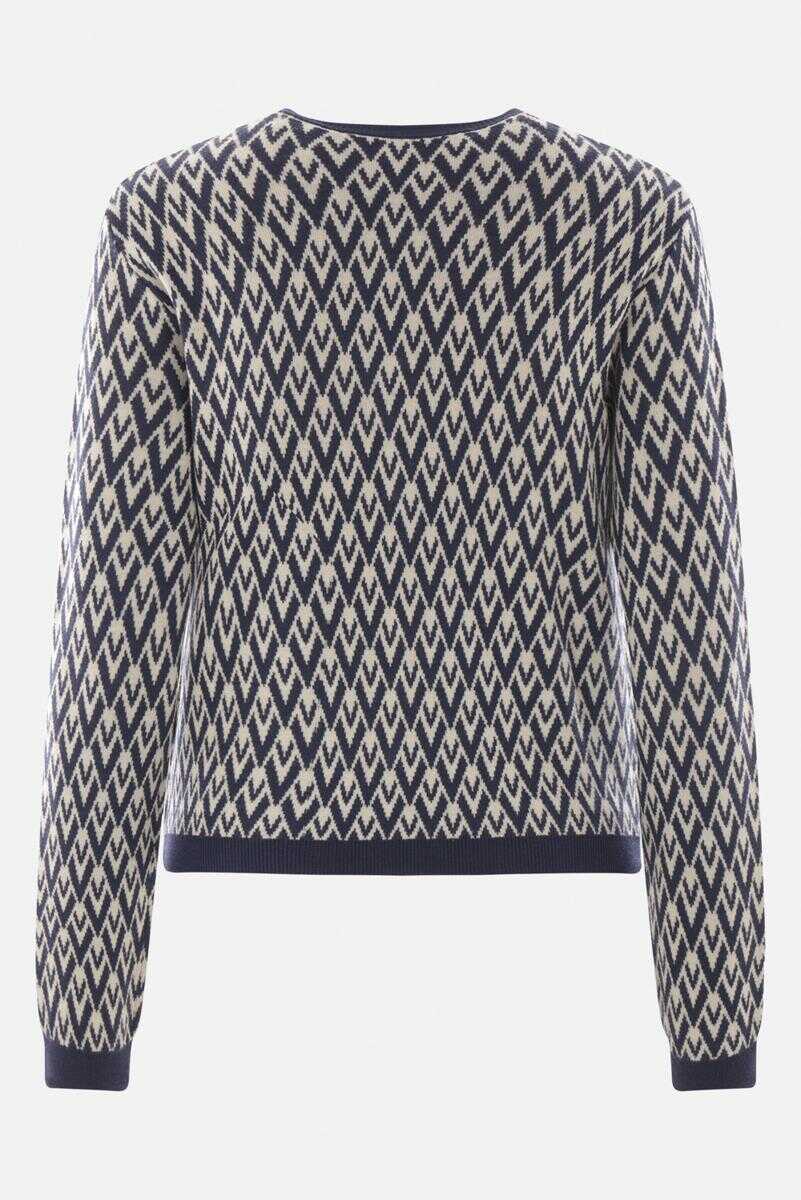 Valentino Garavani cardigan made of wool jacquard with a Toute la V pattern in shades of blue and ivory. Featuring crew neckline, button closure, long sleeves, ribbed edges and a straight hem.