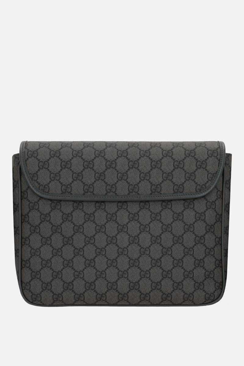 Gucci's shoulder bag crafted in grey and black GG Supreme Tender canvas with grey grained leather trims. It features silver-tone hardware, magnetic button closure on flap and adjustable shoulder strap with leather reinforcement. Natural canvas-lined interior with zip pocket. The design is completed by a zip pocket hidden by the flap and the unmistakable metal Double G logo.