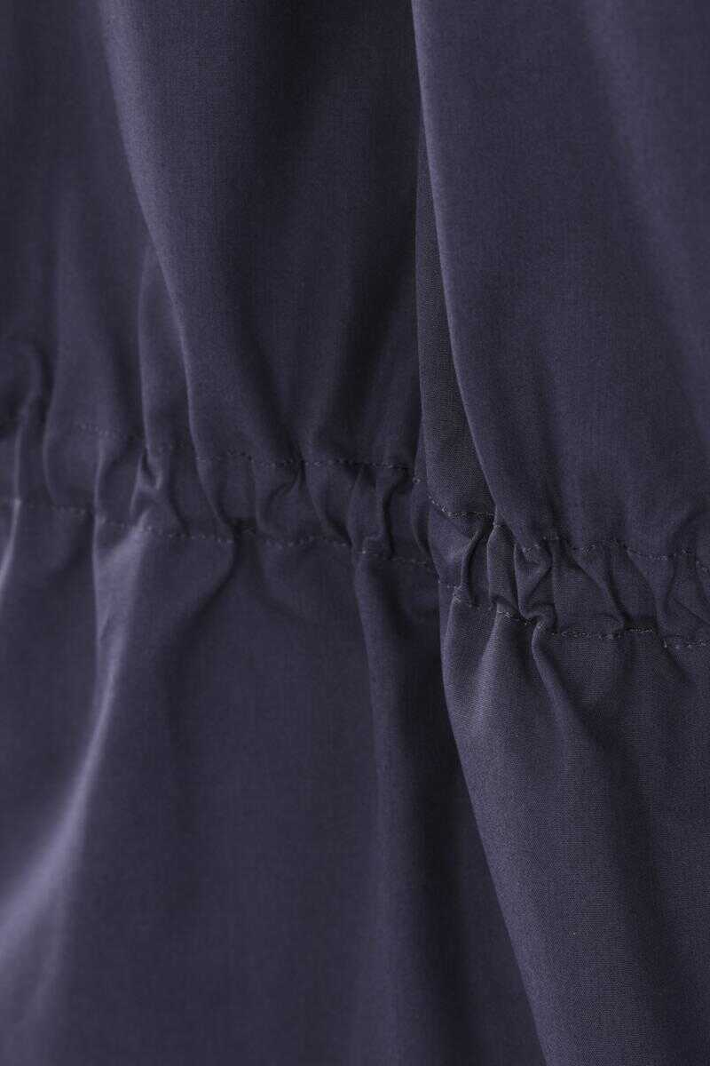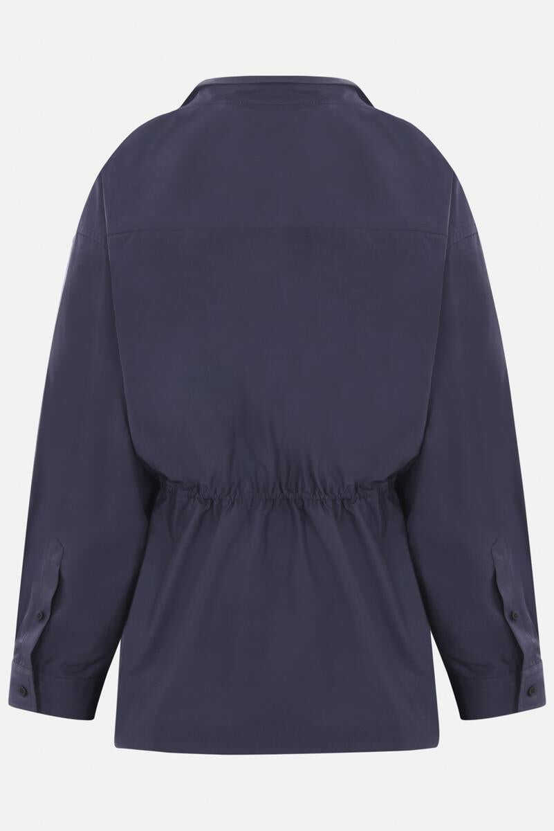 Balenciaga minidress made of faded blue cotton poplin. Featuring a shirt collar, asymmetrical button closure, drawstring waist, long sleeves with buttoned cuffs, and a rounded hem.