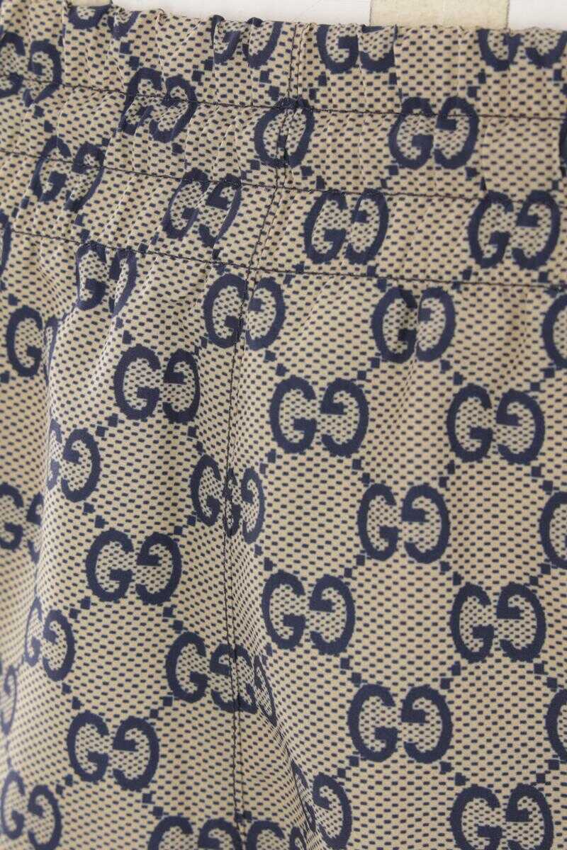 Gucci swim shorts crafted in beige and blue technical poplin with an all-over GG print and a Gucci logo at the hem. Featuring an elastic waistband with drawstring, multiple pockets, and an internal mesh brief.