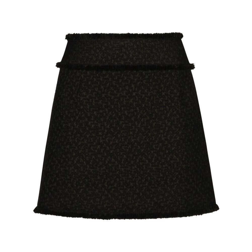 Black bouclé construction frayed edge high-rise concealed rear zip fastening thigh-length straight hem