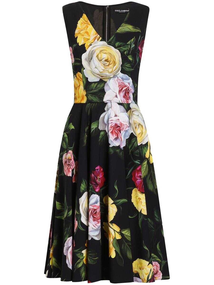 Stretch cady full-length skirt dress embellished with Peonies and Roses print. The cut-out waist and V-neckline enhance the figure, while side pockets and back zipper closure add practicality. Semi-lined in stretch silk crepe de chine, it is perfect for an elegant and refined look.