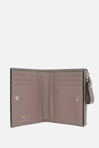 Valentino Garavani's compact wallet crafted in powder pink grained leather adorned by signature platinum-tone metal studs. It features internal snap-button closure and external zip coin pocket. Leather / fabric-lined interior with bill compartment, four slip pockets and six card slots. The design is completed by the unmistakable logo embossed at back.